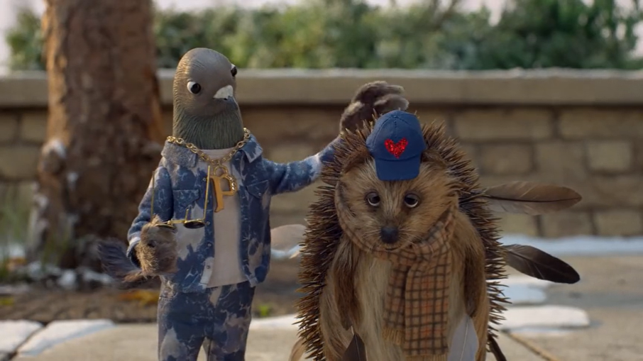 雪人降落在城市的大马路上,遇见一辆轮胎坏了无法前行的小汽车,它取下自己的上半身,雪球变成爱心的轮胎形状,助力小汽车远行。小汽车上的乘客,将手里抱着的爱心形状的 Waitrose 包裹,留在了一户人家的门前。收到 Waitrose 包裹的人家,用望远镜看了看对面孤独在家的邻居。于是从包裹中抽出一根紫色长绳,将属于自家的节日氛围与幸运传递给邻居。邻居从紫色长绳散开的礼花中,接到一张玩笑卡片(Joke),他对着上面写的段子大笑不止。从自己家的床上、浴缸里,一直笑到了公交车上。小男孩回到家中,手捧一个 John Lewis 的购物纸箱。从纸箱中掏出一颗红彤彤的爱心,爱心在家庭成员中传递,最终被挂在了圣诞树上。窗户外,鸟先生看见了小男孩家中的景象,他随后回到了鸟朋友们的团队中。一只小刺猬挥了挥手,表示想加入鸟群。无奈自己没有翅膀,他有点丧气。忽然,一位小鸟先生将自己带着爱心的鸭舌帽戴在了刺猬的头上。随后,大家一同乘着飞机飞上了蓝天,在天空划出爱心的形状。镜头一转到车窗内,此刻又变成了毛毡动画:一位小女孩望着手中断掉的眼镜,难受默默流泪。旁边这位叫 Selina 的乘客,从手中的苹果身上撕下一块红色贴纸,粘合了断掉的眼镜。小女孩于是破涕为笑。车门打开,转回到实景影视:原来车上的小女孩,就是片头那位穿黄色外套、撑红色雨伞的小女孩。她抬头往天上看,看见广告片中出场的那只篮球,看见鸟儿先生们开着的飞机。屏幕上缓缓出现一行字:「Give a Little Love, Together We Can Make a Big Difference 付出爱,我们一起创造不同」。至此,今年的 John Lewis 圣诞季短片《付出一些爱 Give a Little Love》就在这反复横跳的画风中结束了!