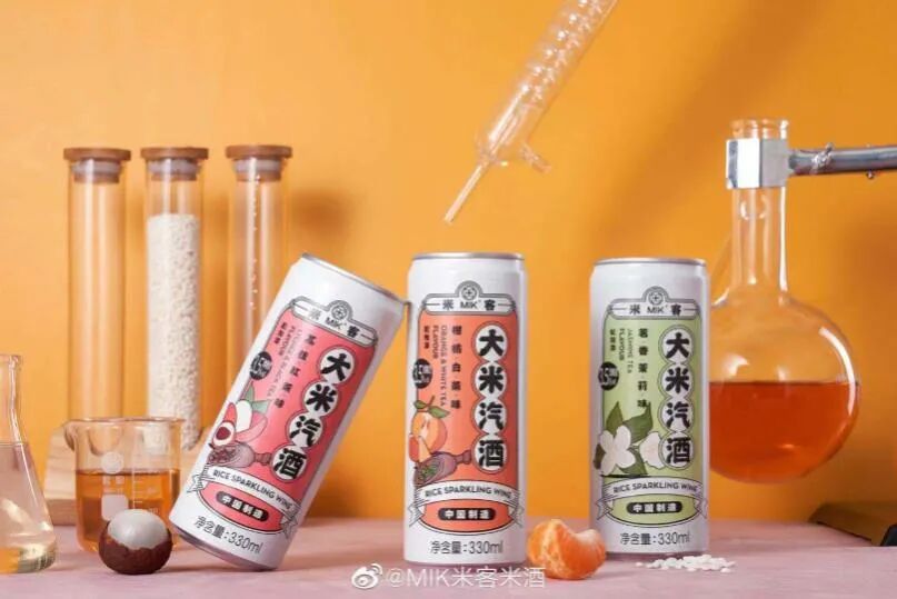 在米酒有类无品的市场条件下,米客把年轻一代的90后作为目标群体,针对他们的喜好研发米酒类产品。在2020年推出新品“汽水酒”,定位“东方复古型汽酒”,包装极具国潮风格,选用了三种中国古典色,在搭配上首次采用了果、茶、米、汽、酒、多种复合元素。