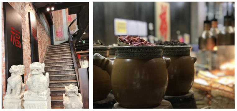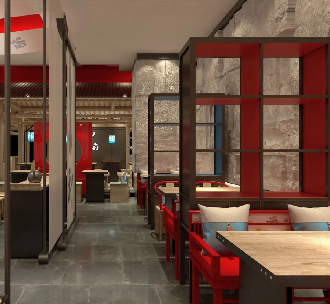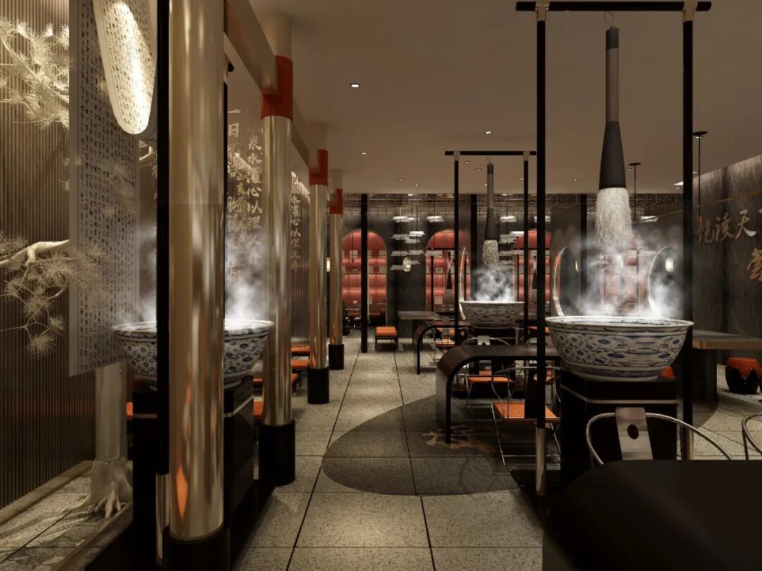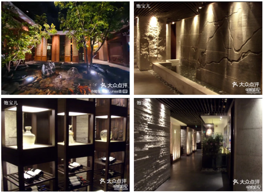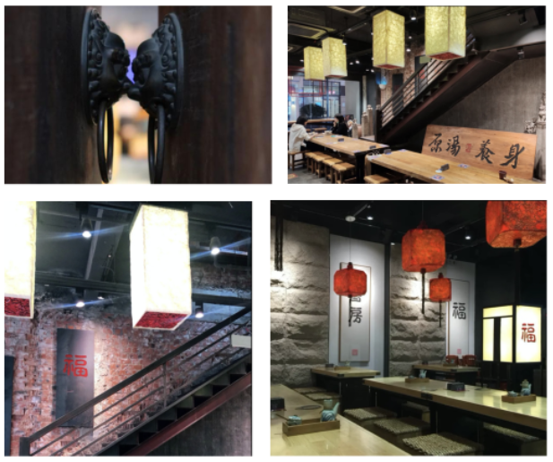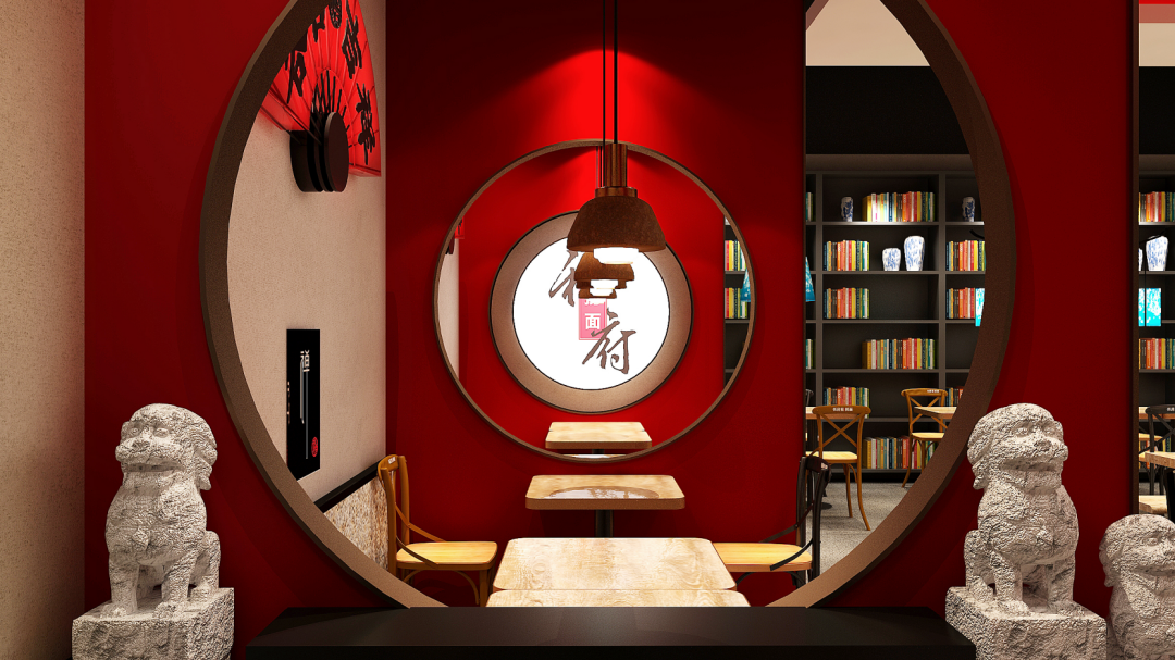 早期的和府捞面门店风格,可以说是相当古朴厚重,整体氛围浮现出十足的禅意,细节设计也颇有意境,将古风元素体现得淋漓尽致。空间以古木色为主要色调,石墨屏风与红色的大灯笼交相辉映。餐厅的门口摆放着龙头和水井,另一侧是实木桌椅,笔墨纸砚,古风檐墙,红灯黑樑,龙王戏水,藏书上千本。