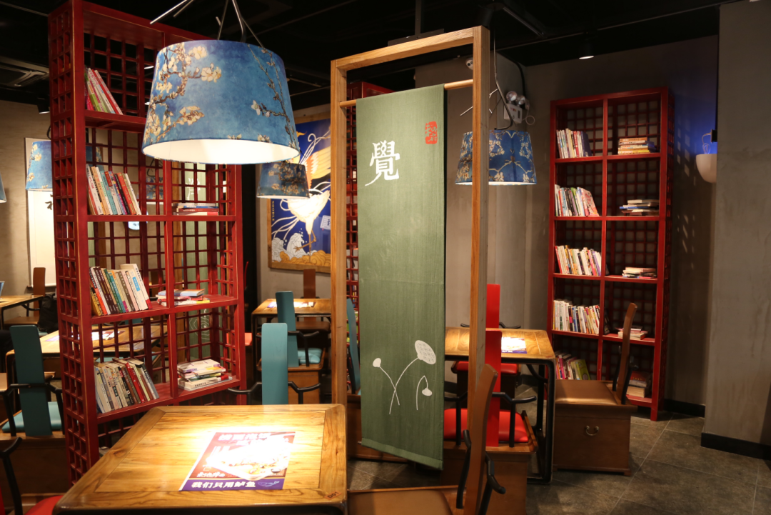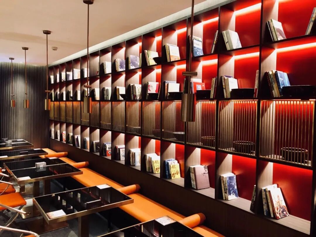 店内红蓝与黑的色调搭配,让视觉呈现的更加现代酷炫,而书房元素恰到好处的穿插又让现代与古代的边界变得模糊起来。