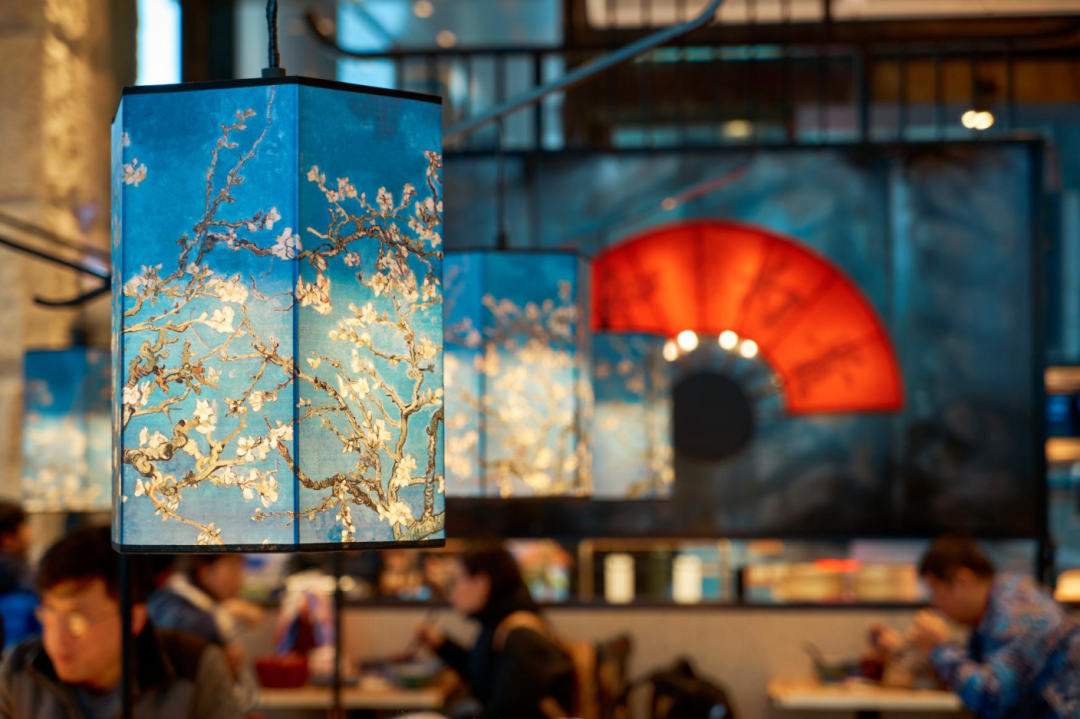 苏州观前街店是和府第二家店,也是和府捞面早期门店设计中值得一提的佳作。老门扇传递着苏式府邸的古朴,门环采用中国传统的狮子来进行修饰。从靠墙书架、细致美艳的中式铜版画,到繁花盛放的中式布灯、印章样的顶灯,处处充满书卷气息。