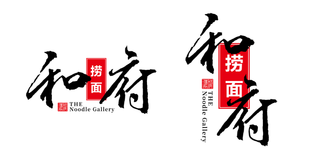 在LOGO设计中,最初的四个字“和府捞面”,实际是由毛笔书写而成的,苍劲有力。从结构上来看,四个字整体紧凑柔和,“和府”的品牌和“捞面”的品类均十分突出。