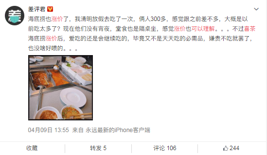 前两天#海底捞复工后涨价约6%#的话题也登上热搜,有网友晒出菜单,两人吃了快400块。