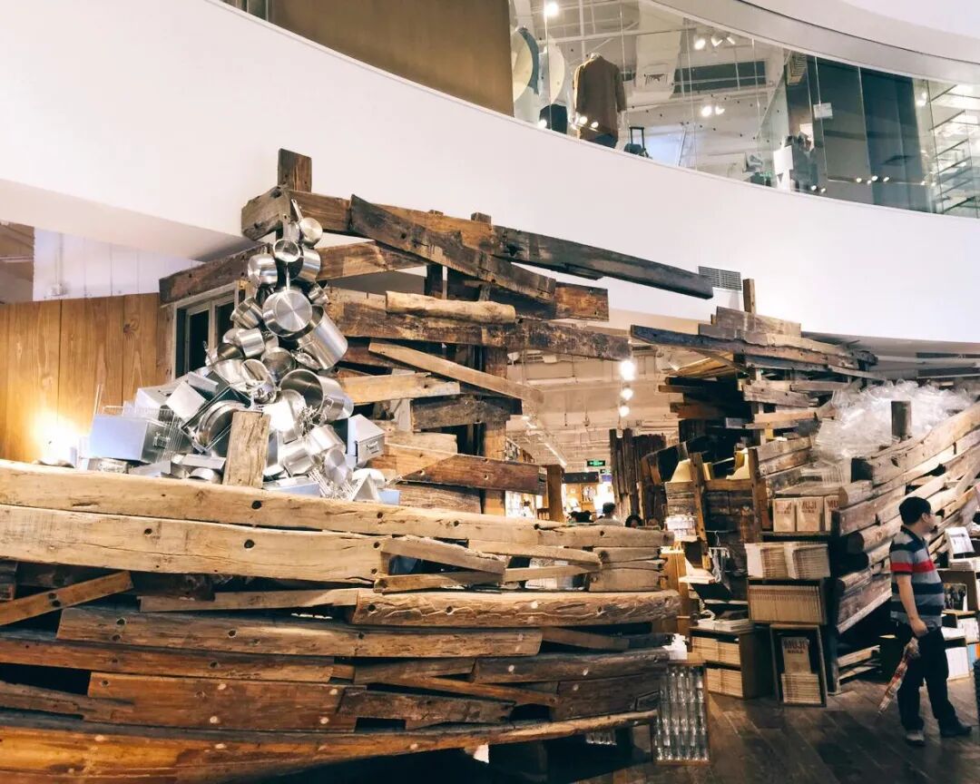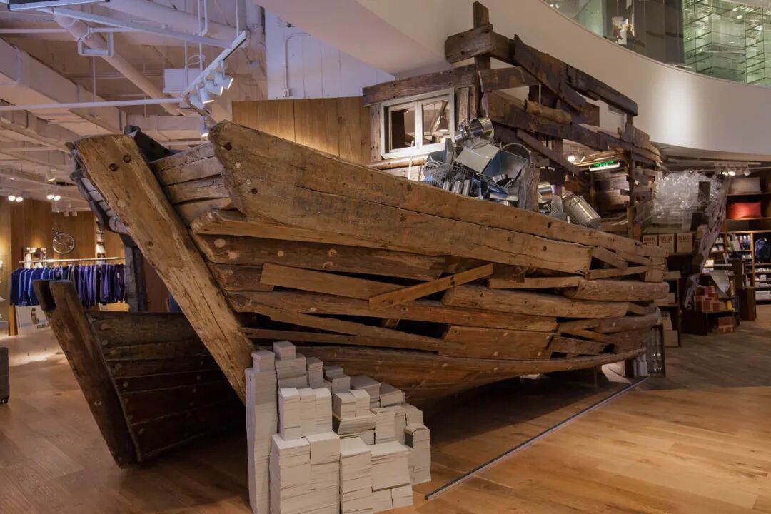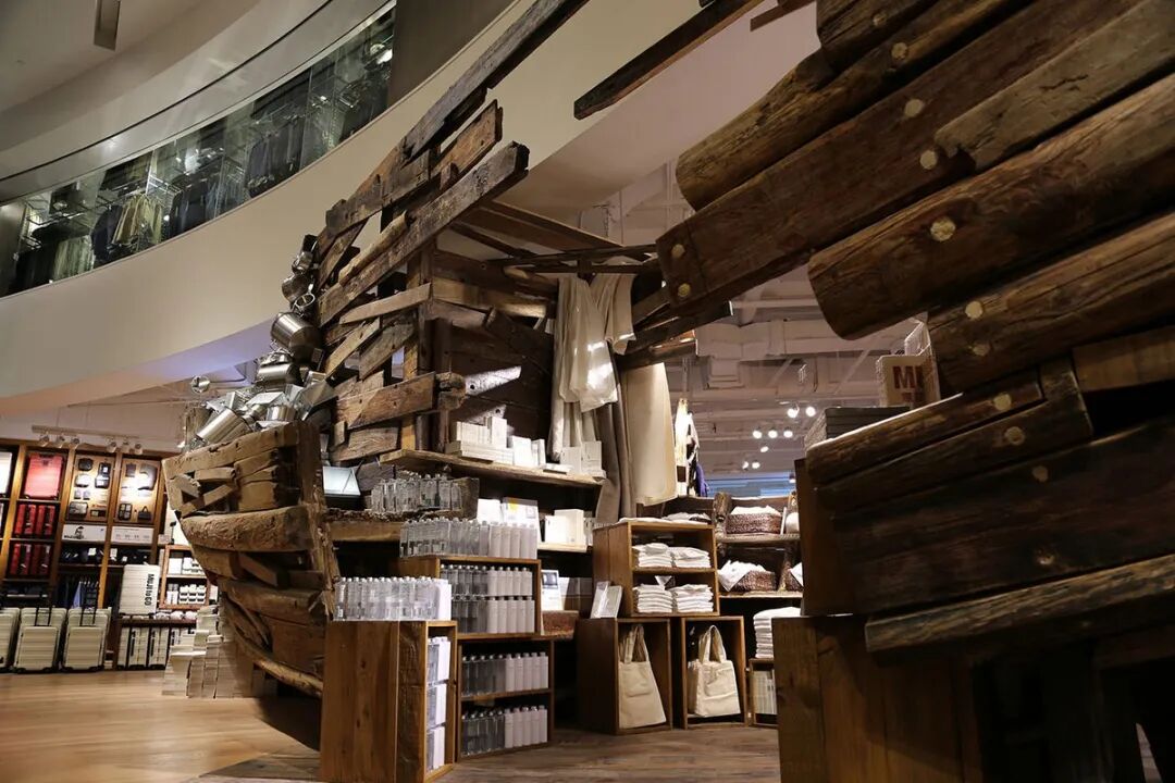 但杉本贵志也没有完全放弃美术,成为一名室内设计师的同时,他还是武藏野美术大学的教授。可能是设计经验的积累,他在执教时一再强调:更多的去体验、更多的去感受!设计MUJI第一家门店的时候,杉本贵志是存了“叛逆”的心理的。那个时候日本的社会风气,“奢靡”二字就可以形容,周围的店铺装修,要求的就是漂亮、华丽。杉本贵志的内心是抗拒的,他只想自然地做自然的事情,这才有了MUJI朴素自然的店面。后来他在《无印良品》里写道,“回首往事,我想正是这种精神才让我们那么有创造力”。上海的MUJI旗舰店里,最吸引人的应该是一艘“破船”,不是夸张,因为整艘船很大,中间被设计成门店的入口,底部的木板像是“补丁”一样地排列,船上还堆着一堆收纳盒。但整体就营造出一种引人探寻的感觉:这个船看起来有年头了,里面会不会“宝藏”?其实在上海MUJI旗舰店开业当天,有人问杉本贵志,“放一艘破船体现了怎样的设计理念呢”?或许很多人对于设计师的印象就是,每一处都有着“阅读理解”式的考量,但放在杉本贵志这里就不一样了,这些设计就像随意摆放的,怎么自然怎么来,却很贴合MUJI的调性。带着这种特征的,还有MUJI HOTEL深圳旗舰店。引入眼帘的是巨大的木板背景,毫无装饰的拼接样式让人打心底觉得舒服,整根木条的长凳有一种“原始”的味道。