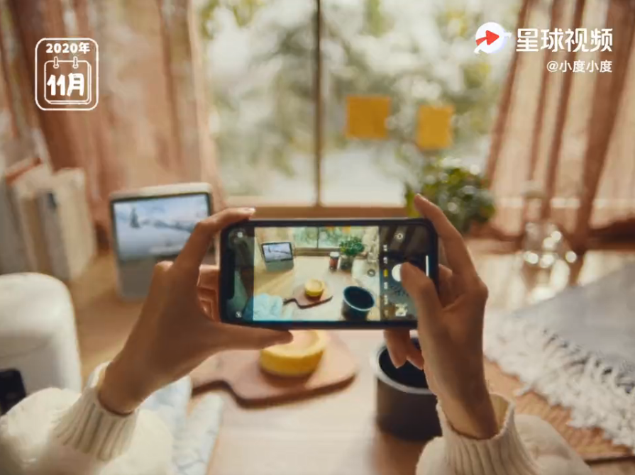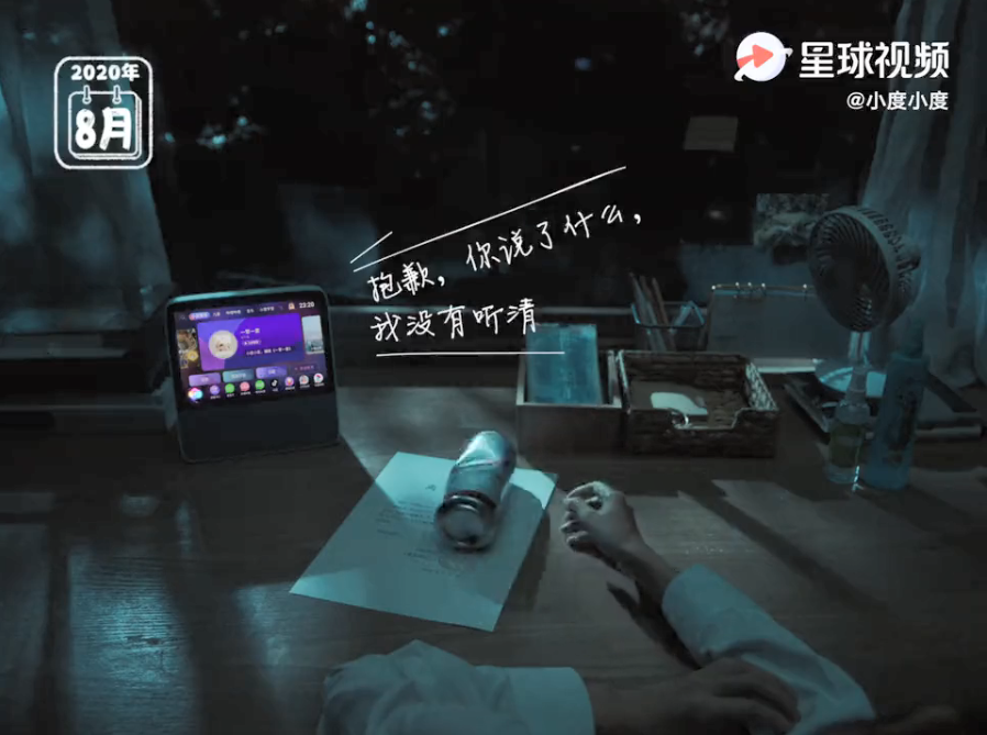 全片只有一个固定镜头,整个画面只有一桌、一窗、一小度这一个单一场景,没有人物出镜,让观众通过场景的变化和文案的交代来回顾 2020 年,展现年轻人在孤独的时候,有小度陪伴的故事,引出“小度在家,陪伴在家”的品牌核心slogan。