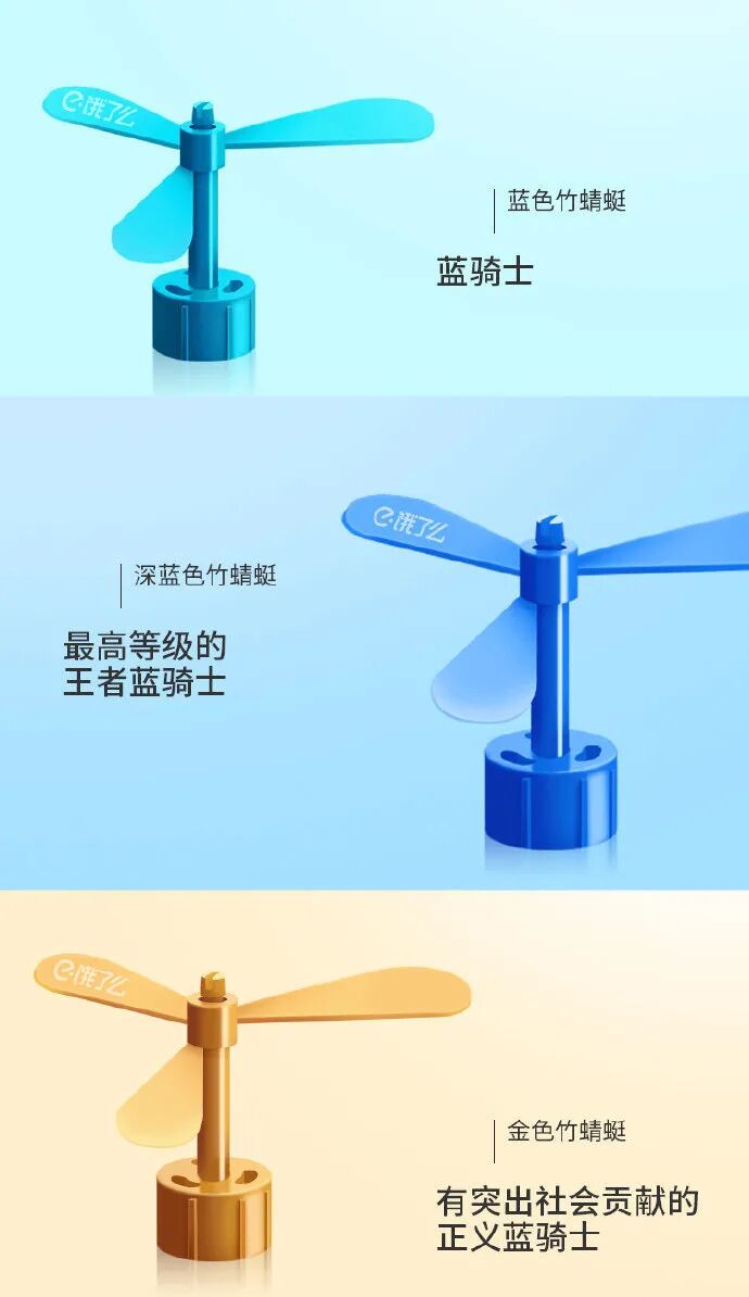其意图很明显,以进一步传递出品牌态度:“饿了么不再只是一个送餐平台,它想要满足用户的更多需求,成为一个值得信赖的生活服务平台。”说到“品牌升级”,这让我想到此前饿了么竹蜻蜓IP符号的打造。此前,饿了么不仅打造哆啦A梦竹蜻蜓IP符号,还对自己的竹蜻蜓进行分级锻造,为蓝骑士打造了荣誉体系,将以浅蓝、深蓝以及金色的竹蜻蜓作为「勋章」,区分蓝骑士的不同「等级」。浅蓝色竹蜻蜓将被授予“新星蓝骑士、达人蓝骑士、精英蓝骑士”;深蓝色竹蜻蜓将被授予“王者蓝骑士”;金色竹蜻蜓则被授予“正义蓝骑士”。 其实,不止饿了么,其最大的竞争对手美团也玩过这一“套路”,推出萌趣袋鼠耳朵,还发布了多款周边产品。当然还有麦当劳,麦当劳配送员的头盔上也曾出现过鸡腿小装饰,既萌又飒,俘获了不少人的目光。最先开始在头上“动土”的是美团,从2018年开始,在每年的7月17日骑士节上,美团发给外卖骑手的专属节日礼品就是袋鼠耳朵。据悉,袋鼠耳朵通常是发给优秀骑手,作为嘉奖和肯定。2020年4月,麦当劳给外送骑士的头盔加上了鸡腿;5月,饿了么给外卖小哥头盔装上了竹蜻蜓,随后骑手们头盔上还出现了小黄鸭、齐天大圣、小恶魔+脏辫等造型。7月份,广受网友喜爱的美团头盔耳朵装饰上线“周边”,推出针对普通用户的袋鼠耳朵发箍Kangaroo Ear Mini,无需头盔直接戴在头上。为什么这些巨头品牌们扎堆造符号?符号营销究竟有什么魅力?