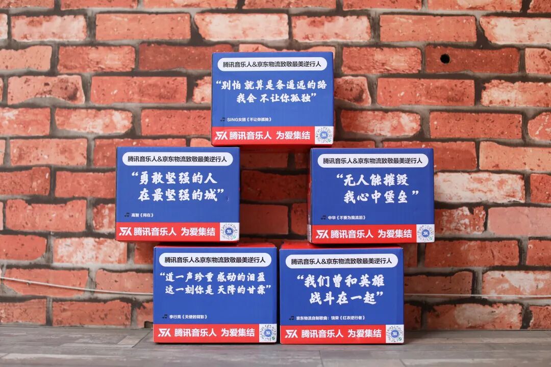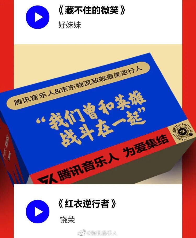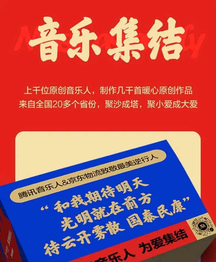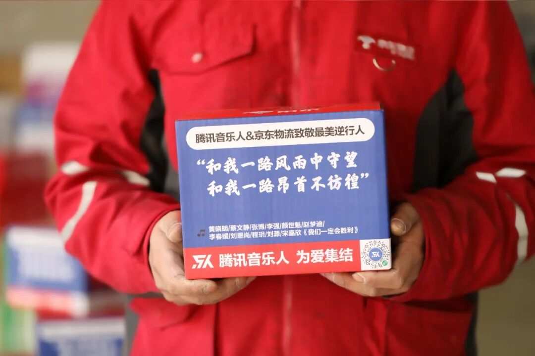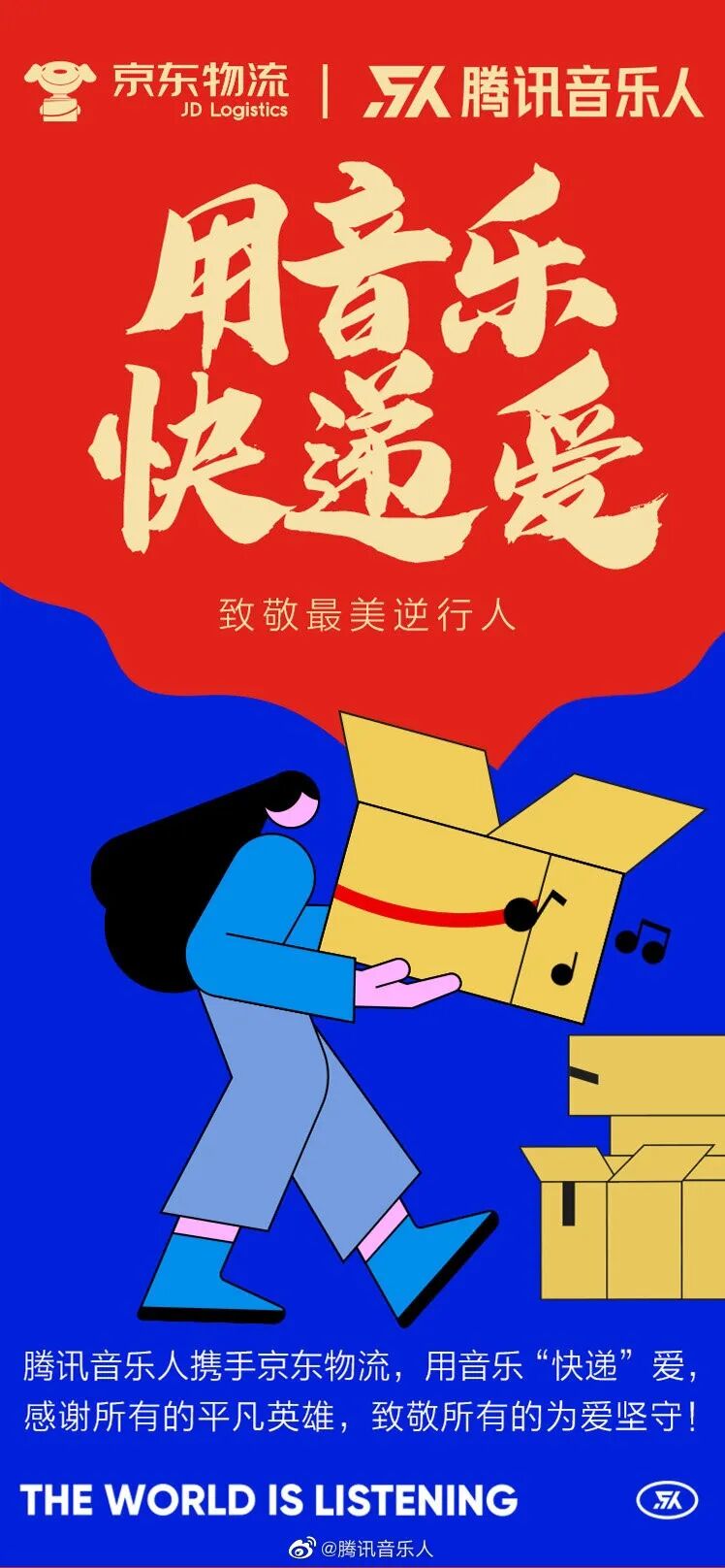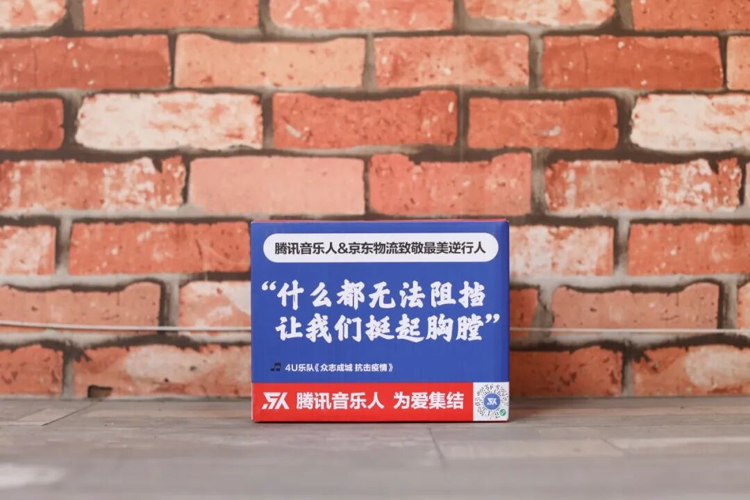 而最近,腾讯音乐人与京东物流联合推出“致敬最美逆行人”活动,号召众多音乐人参与,征集了众多优秀抗疫歌曲,并在线下各大城市投放致敬歌词快递盒。以音乐疗心,借音乐的形式,给疫情中的人们强烈的情感慰藉,成为全民战“疫”下一抹温暖人心的亮色。