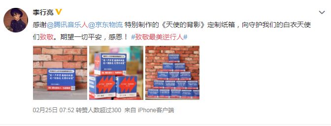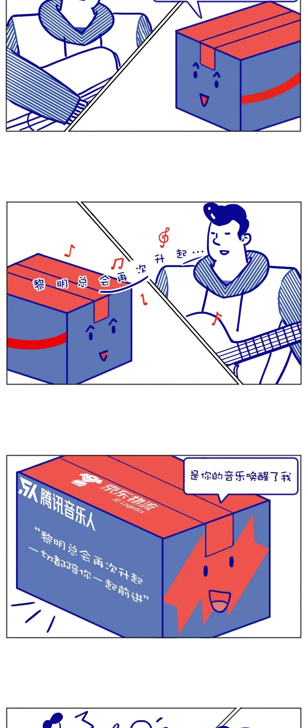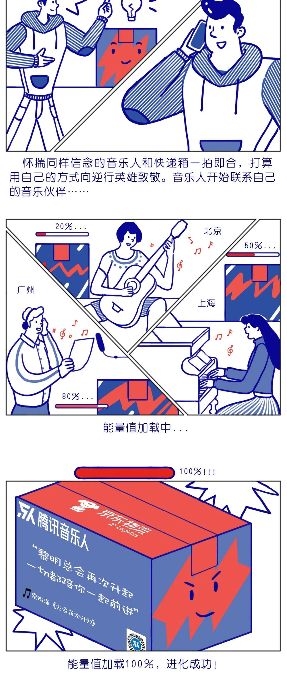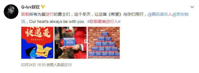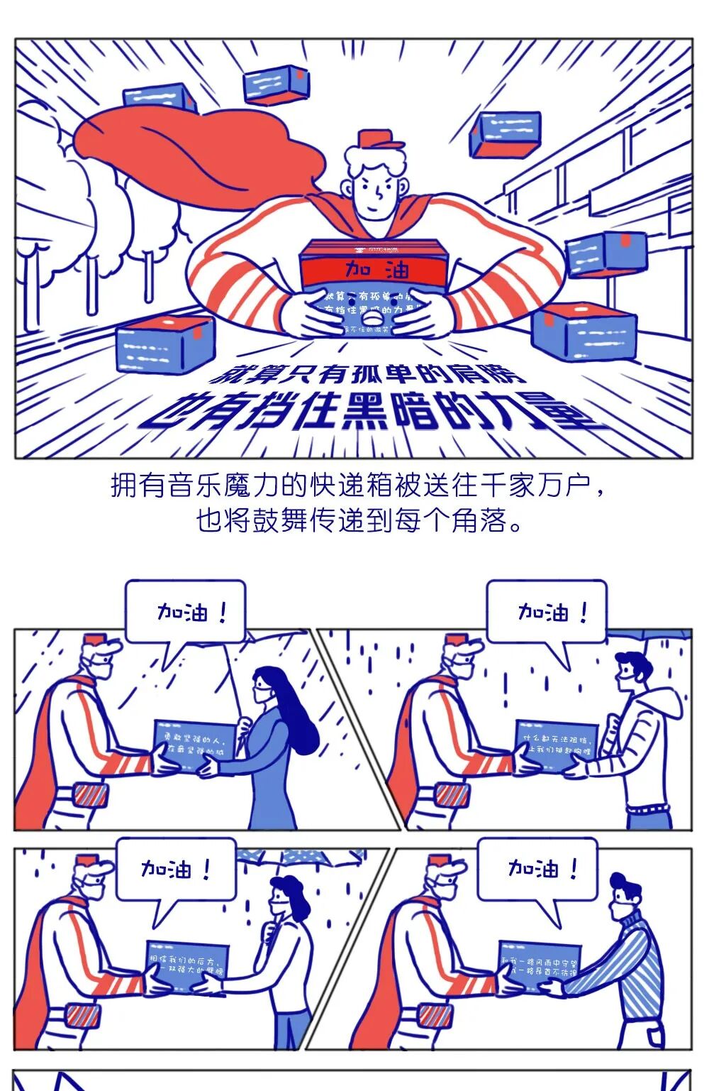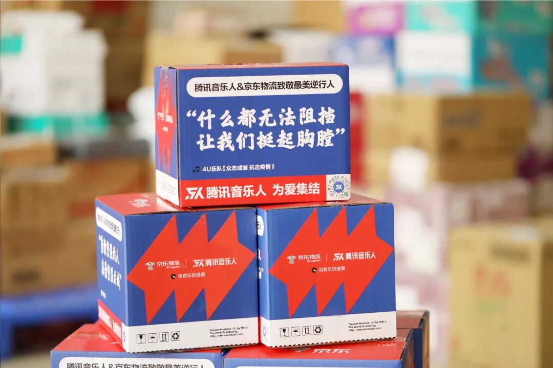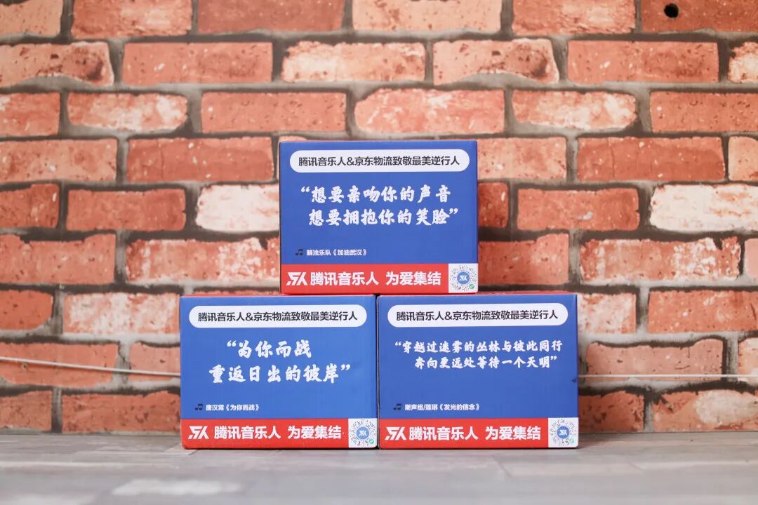而最近,腾讯音乐人与京东物流联合推出“致敬最美逆行人”活动,号召众多音乐人参与,征集了众多优秀抗疫歌曲,并在线下各大城市投放致敬歌词快递盒。以音乐疗心,借音乐的形式,给疫情中的人们强烈的情感慰藉,成为全民战“疫”下一抹温暖人心的亮色。