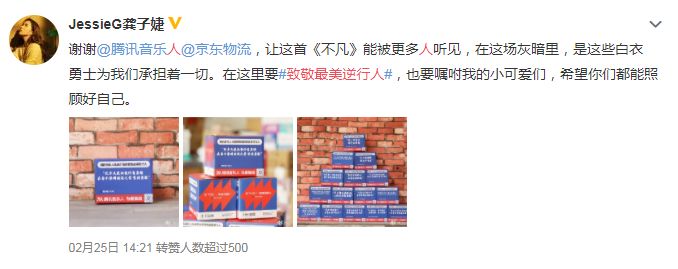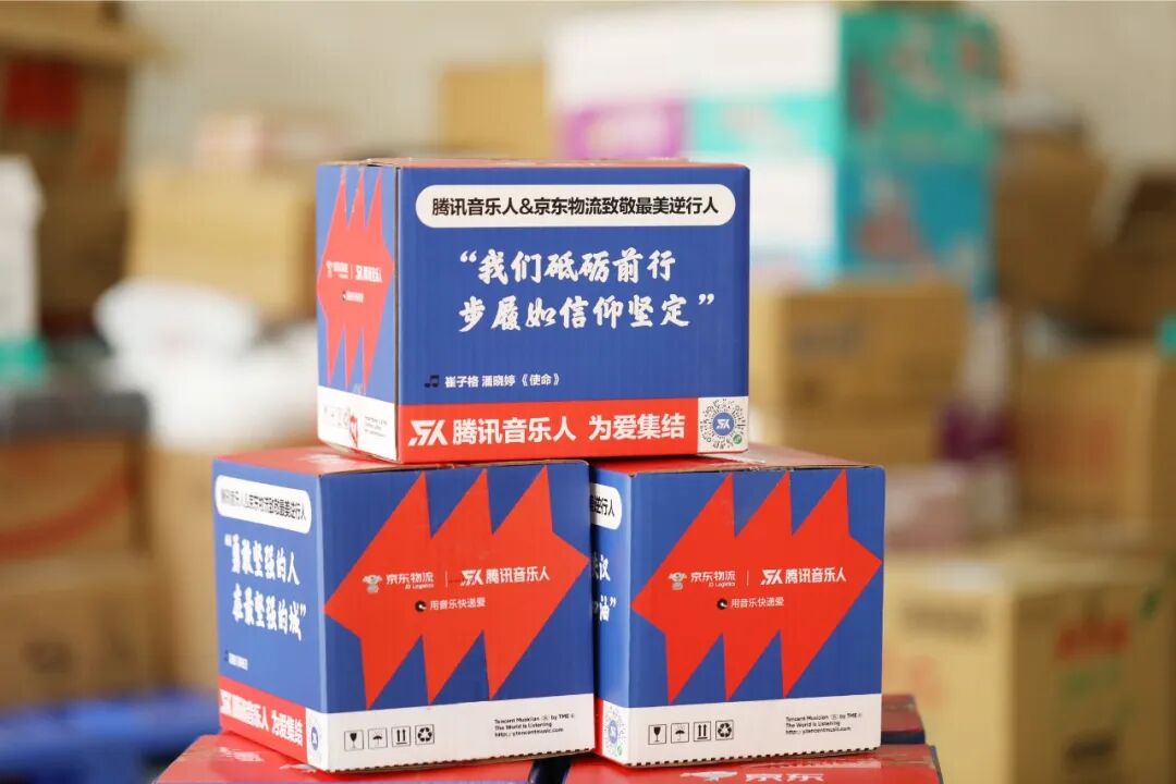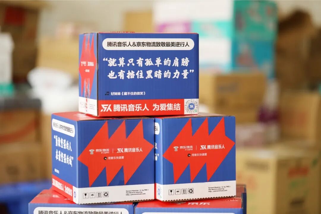 首批印制成品的500万个致敬歌词快递盒已于2月22日正式寄往北京、上海、广州、深圳、成都、重庆、西安等各大城市,依托京东物流寄往千家万户,用温暖人心的歌词传递信念,用音乐“快递”爱与力量。