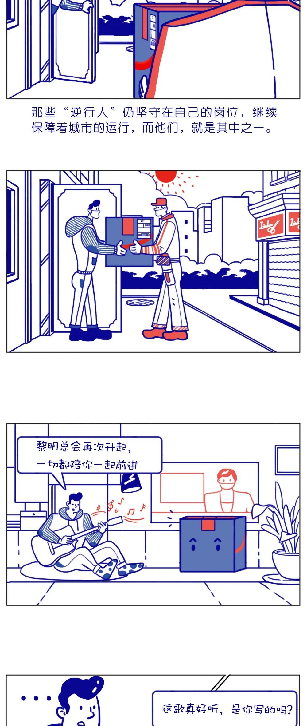 宅、洗手、消毒、戴口罩是大多数普通人抗击疫情唯一能做的。疫情笼罩之下,他们需要日常生活的保障,更需要精神的慰藉和肯定。于是,我们看到许多为爱“逆行”的人,TA们是战斗在一线的医护工作者、武警消防战士、以及保证大家生活稳定的超市运输人员、快递物流工作者……为了疫情早日结束,为了我们的生活一如往常,他们始终坚守岗位。