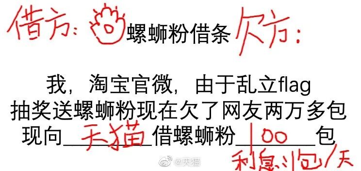 天猫绝对是“真爱”,慷慨解囊给了100包,亲兄弟明算账。一天利息是一包螺蛳粉,不算过分吧!