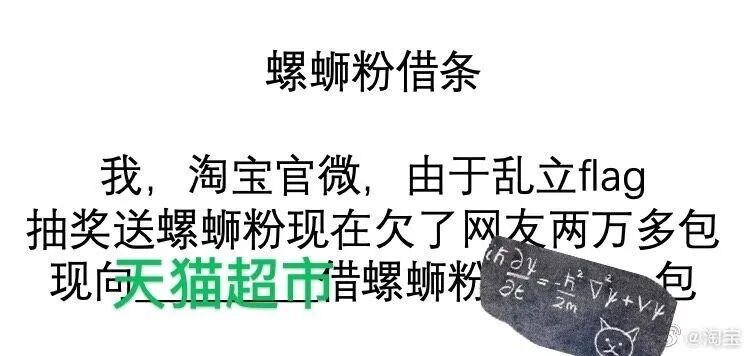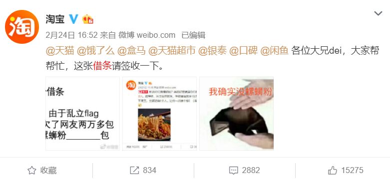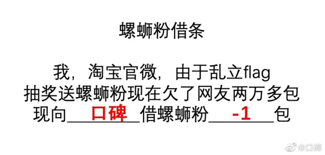 既然预算不够,只好友谊来凑。淘宝小编灵机一动,写了一纸“螺蛳粉借条”,还cue下自己的bro,使出卖惨的大招。