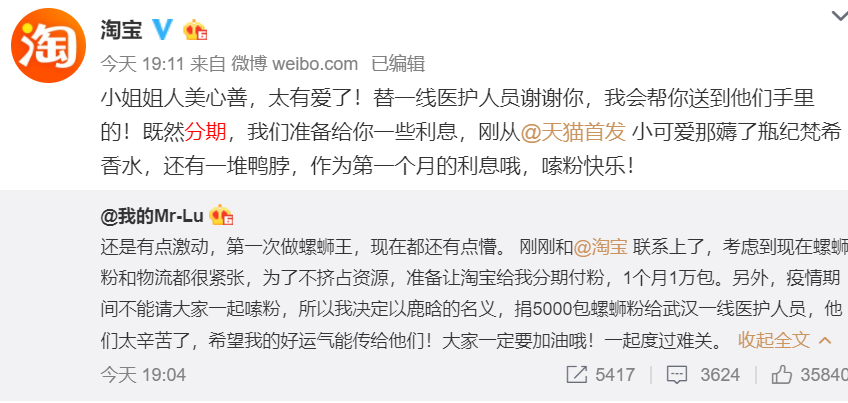 都说善良的人运气都不会太差,中奖人还表示以鹿晗的名义,捐出5000包螺蛳粉给武汉一线医护人员。淘宝和幸运儿一下子将这场嗦粉活动,变成有爱的抗疫公益事件,自然值得点赞。