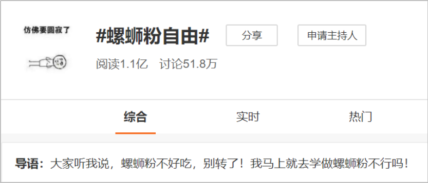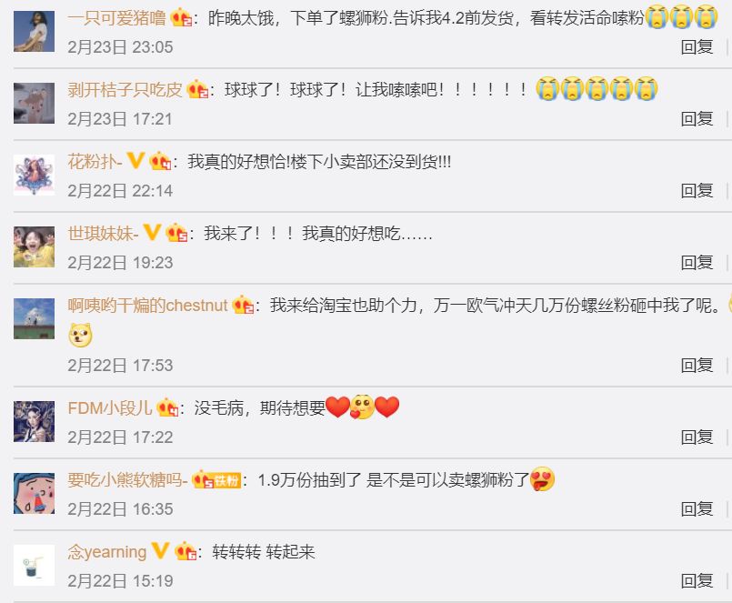 截至目前为止,从微博上可以看到“螺蛳粉自由”活动收割破42万的转发量,而网友@我的Mr-Lu 最终也喜提“螺蛳粉暴发户”称号。
