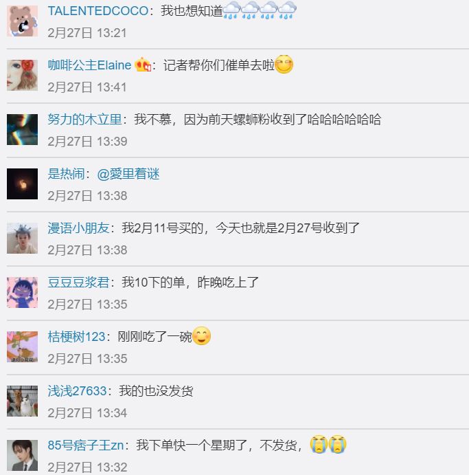 但由于物流和订单大量等原因,网友的螺蛳粉一直没到货,出现了“一粉”难求的局面。网友只好开启“云催单”“云嗦粉”模式,有人表示生无可恋,还有的人全靠意念嗦粉......