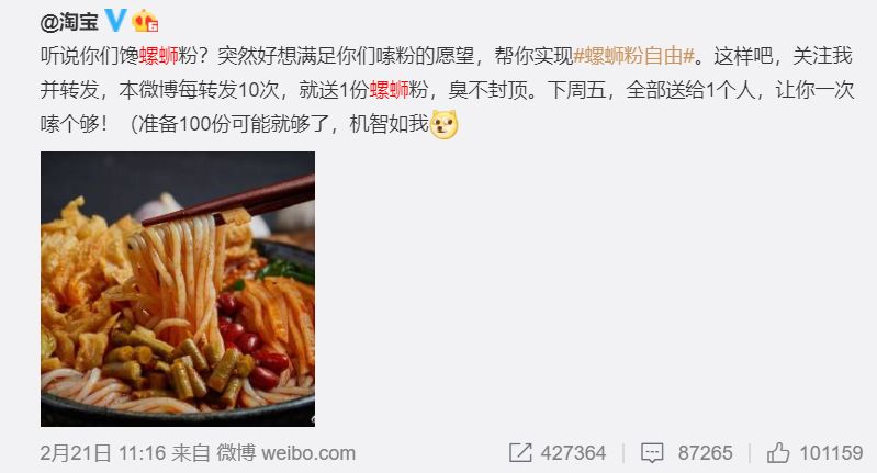 眼看螺蛳粉千呼万唤不出来,淘宝开启“史上最臭”的宠粉模式,放话表示为网友准备100份螺蛳粉实现螺蛳粉自由,活动微博每转发10次送1份螺蛳粉!臭不封顶!