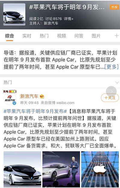 虽然苹果并未公开回应,但造车已是板上钉钉的事,而且该消息一出,#苹果汽车将于明年9月发布#立马冲上微博热搜,短短一天时间,阅读量已达2亿。