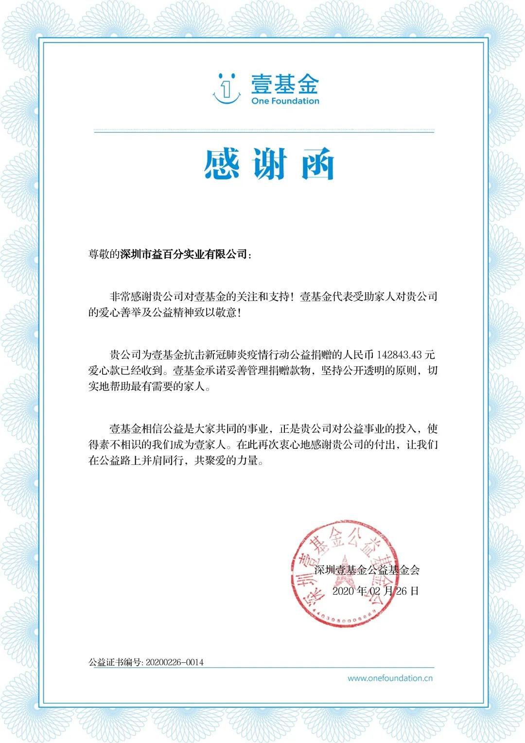 随后,壹基金为益百分发了封感谢函,代表受助家人对益百分的爱心善举及公益精神致于敬意,感谢益百分对公益事业的投入,在公益路上汇聚爱的力量。在疫情面前,益百分再次彰显了始终秉承着“厚德载物”的公益理念,矢志不渝地以行动来支持和关注公益事业。