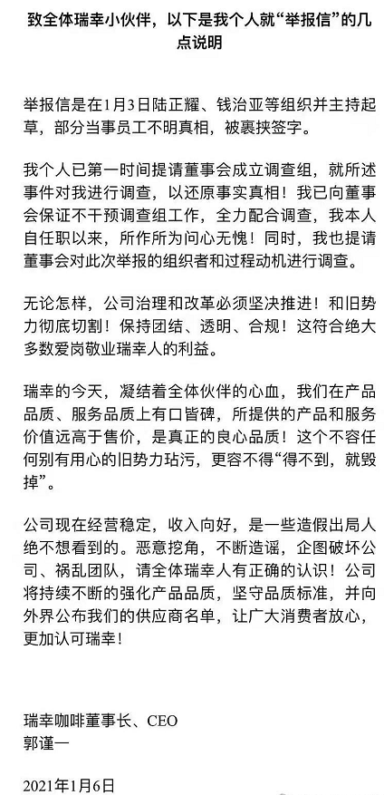 上述联名信曝出不久,当日郭谨一就发布了一则全员信,称举报信是在1月3日陆正耀、钱治亚等组织并主持起草,部分当事员工不明真相,被裹挟签字。