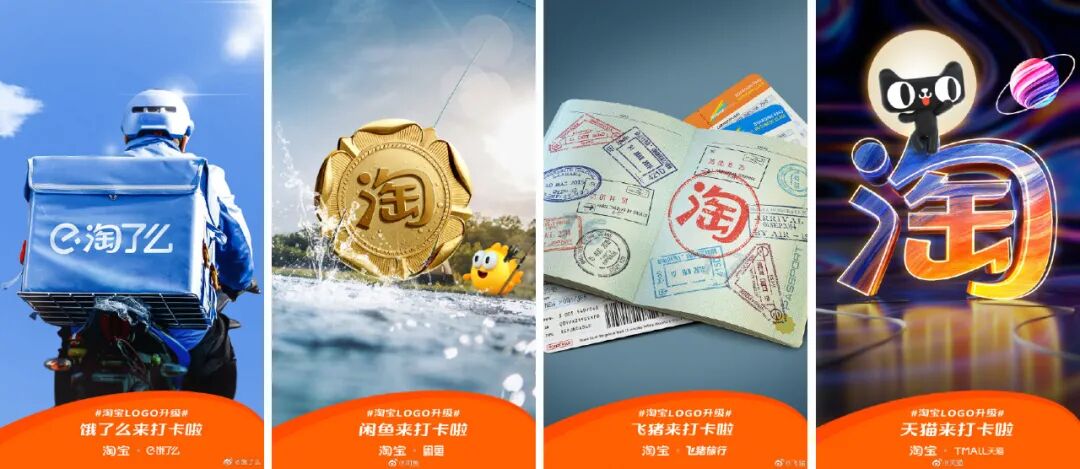 LOGO换新后,阿里系其他兄弟也相继发布了一张带有“淘”字元素的创意海报,来为老大哥宣传打call。