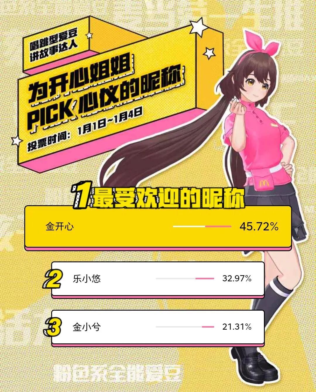另外,麦当劳还为开心姐姐发起了昵称投票活动。目前来看,大家似乎更青睐于“金开心”这个名字。