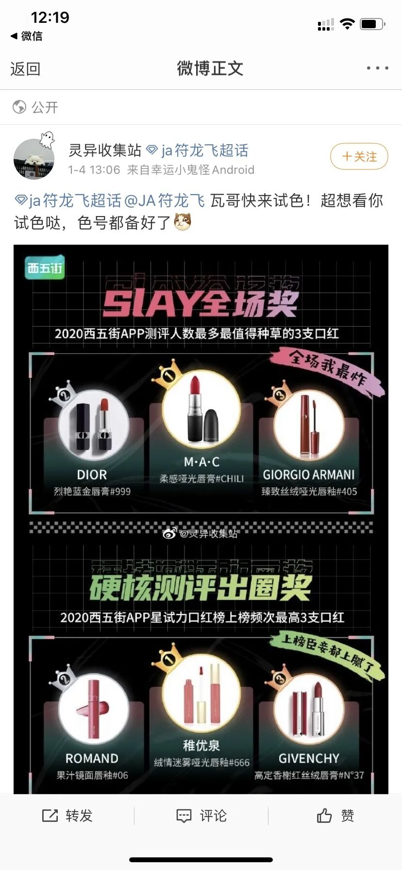 值得一提的是,在《Z世代测评官年度瑞斯拜口红榜》发布后,此前在符龙飞测评活动中享受到爱豆同款福利的粉丝,更是在@西五街APP官微、符龙飞超话等平台,积极喊话符龙飞,想要他试色榜单中的口红。
