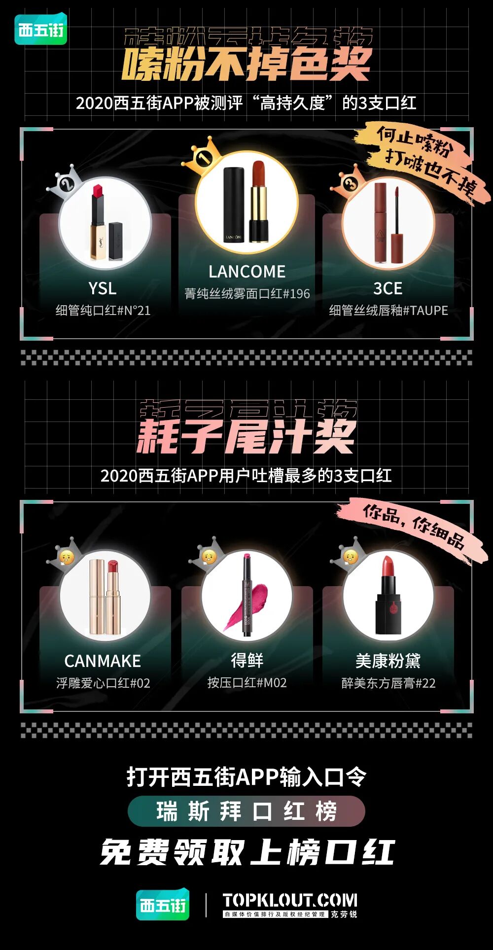 这一点,从西五街最近联合国内领先的权威自媒体价值排行及版权经济管理第三方监测机构@TopKlout克劳锐推出的《Z世代测评官年度瑞斯拜口红榜》也可以体现出来。