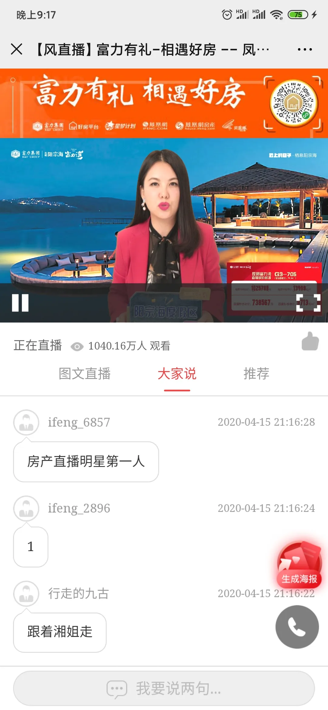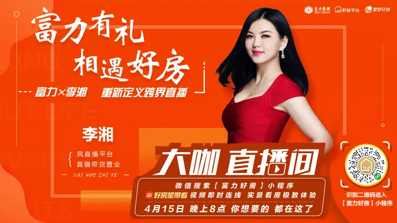 乘着这股直播的东风,4月15日,富力集团携手超级明星主播李湘也开启了“直播卖房”首秀。一个全国知名房企品牌,一个网红直播头部明星IP,在这场主题为“富力有礼 相遇好房”直播卖房行动中擦出了不少火花,7.2折钜惠海景洋房秒杀,8折购房券等活动引发了直播间一次又一次的高潮。