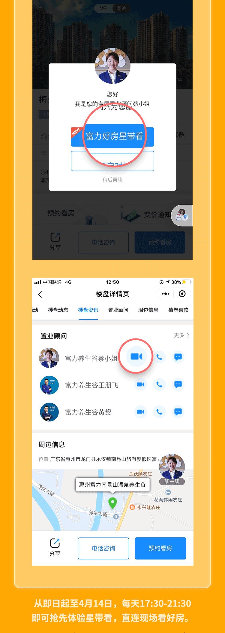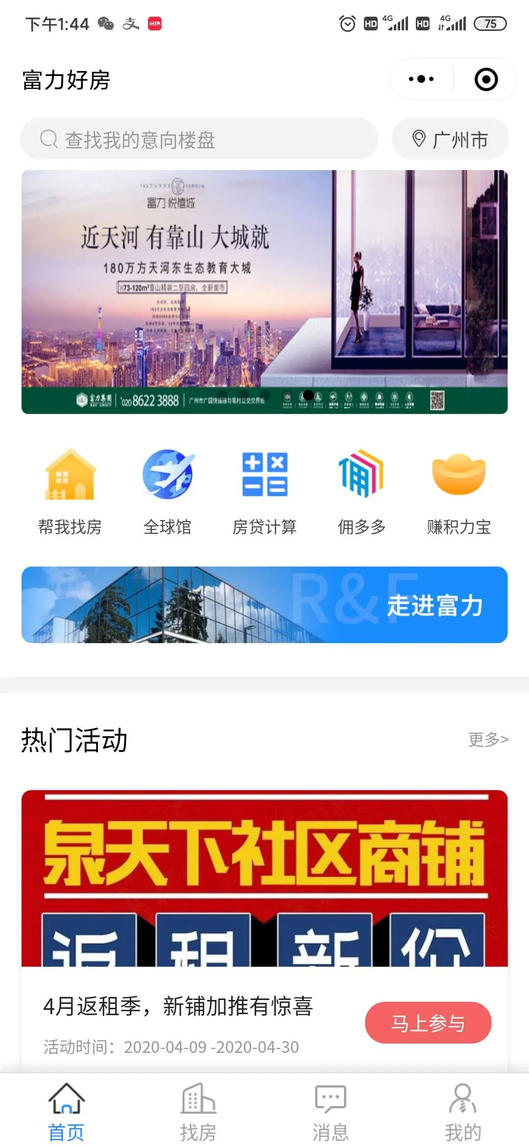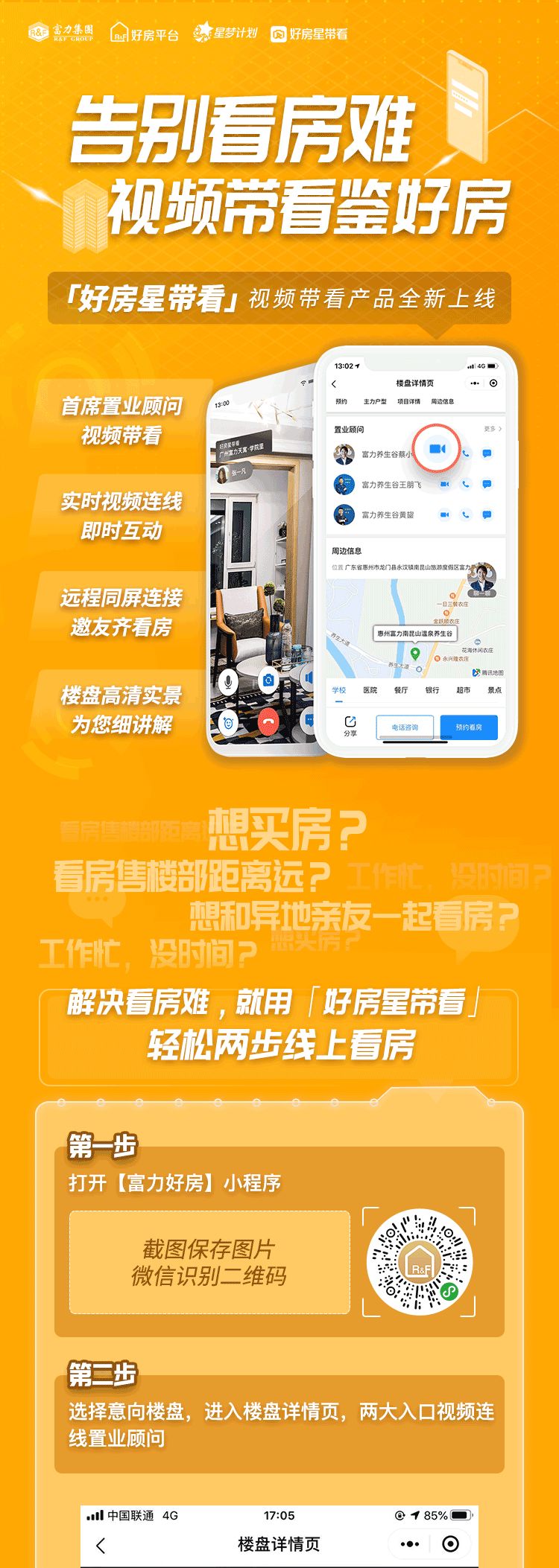 诚然,富力“好房平台”极致体验化的产品体验背后是富力对于房地产营销正在加速实现从传统线下到线上化的进程市场需求,以及客户需求、服务需求的深刻洞察。富力敏锐的意识到获客方式和体验场景的变化。于是,相较于竞品而言,“好房平台”小程序中的新功能“好房星带看”无论是视频带看体验的创新和和后续的认购环节上都做到了极致化体验创新。这是“好房星带看”在众多产品中脱颖而出的原因之一,而我们回顾疫情之下富力以往的营销打法会发现,营销升级与创新早已成为富力营销活动中不可缺少的环节。 不同于其他房企临时推出的线上营销举措,其实早在年初富力集团就正式启动了“好房子,网购吧”创新营销行动;3月20日,富力又将“好房子,网购吧”活动正式升级为“好房子,线上购”,也收获不少线上成交订单。如此亮眼成绩,少不了“好房平台”的全面赋能!