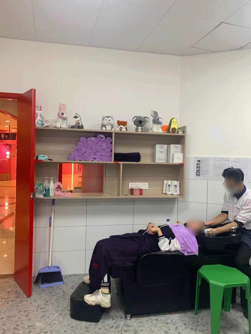 广东清远有家海底捞就设计一个小型发廊,洗头床、镜子、桌台、毛巾收纳架......有模有样。
