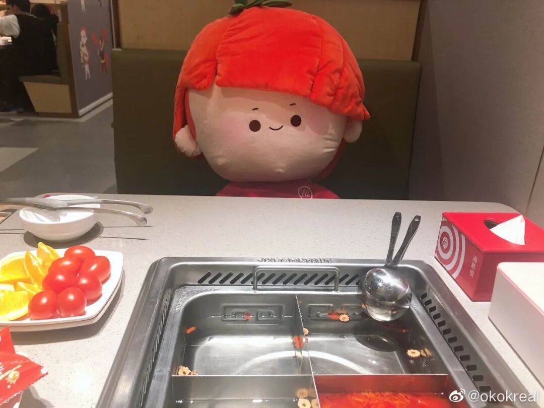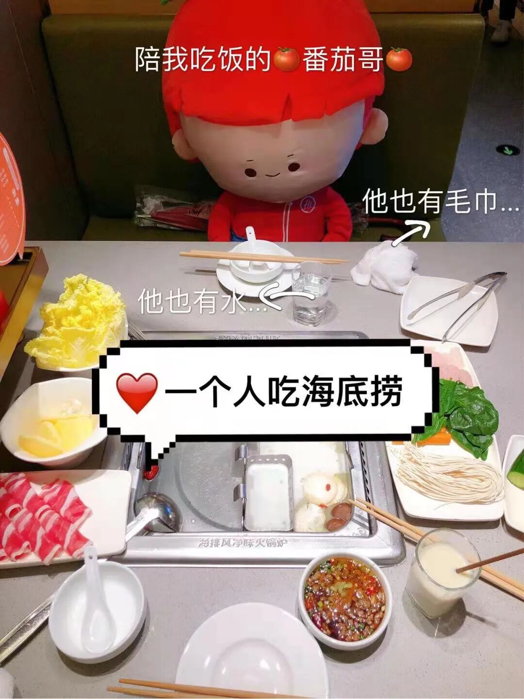 因为一个人去吃海底捞,店员会贴心给你安排一个番茄哥,让你感受到海底捞对单身喵的浓浓关爱。