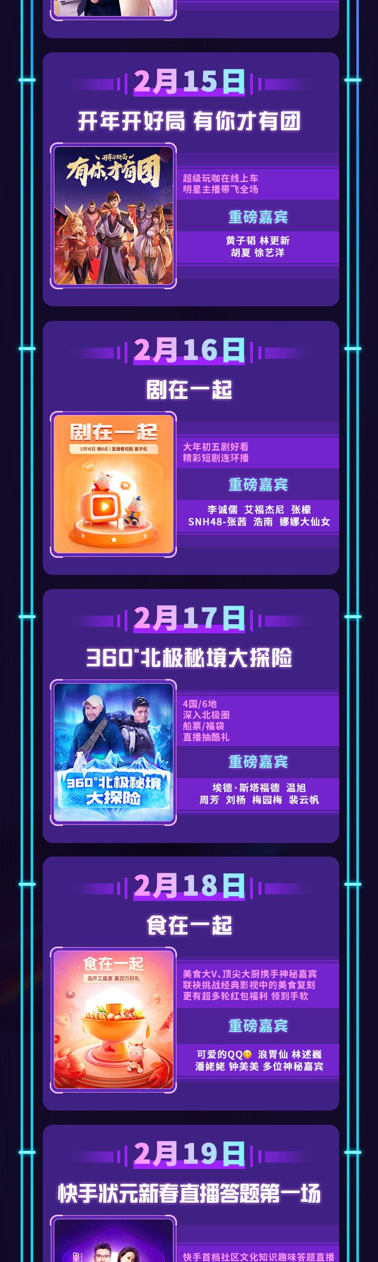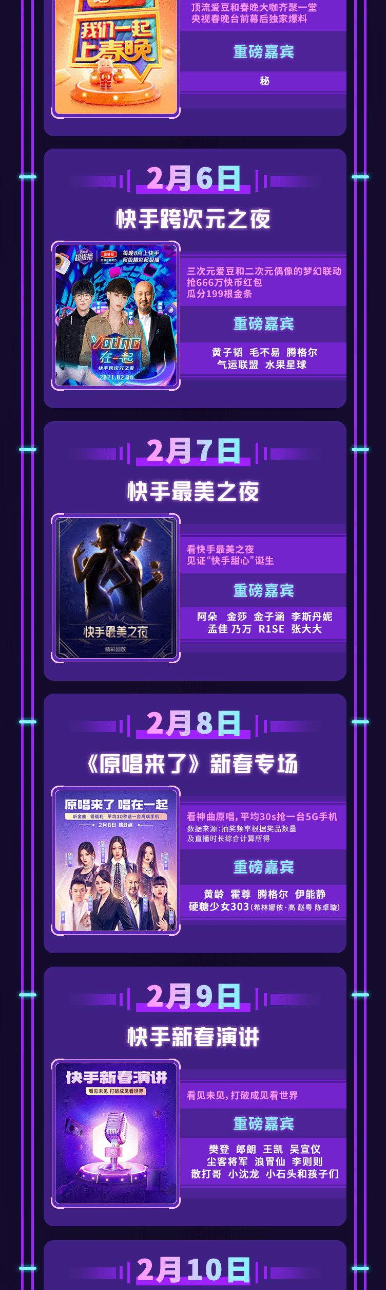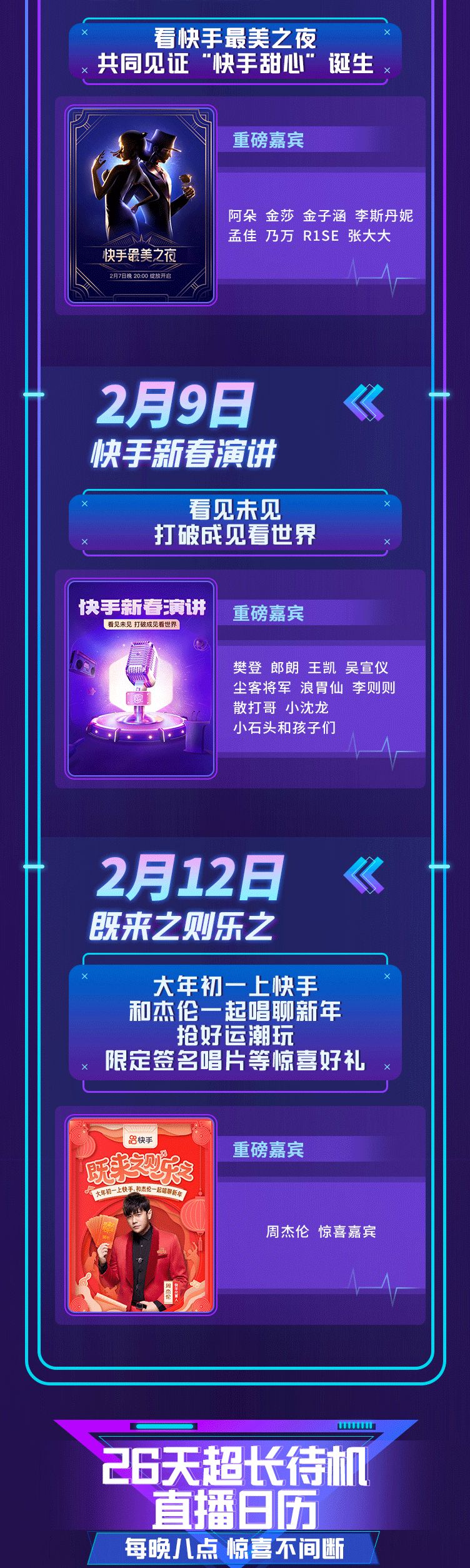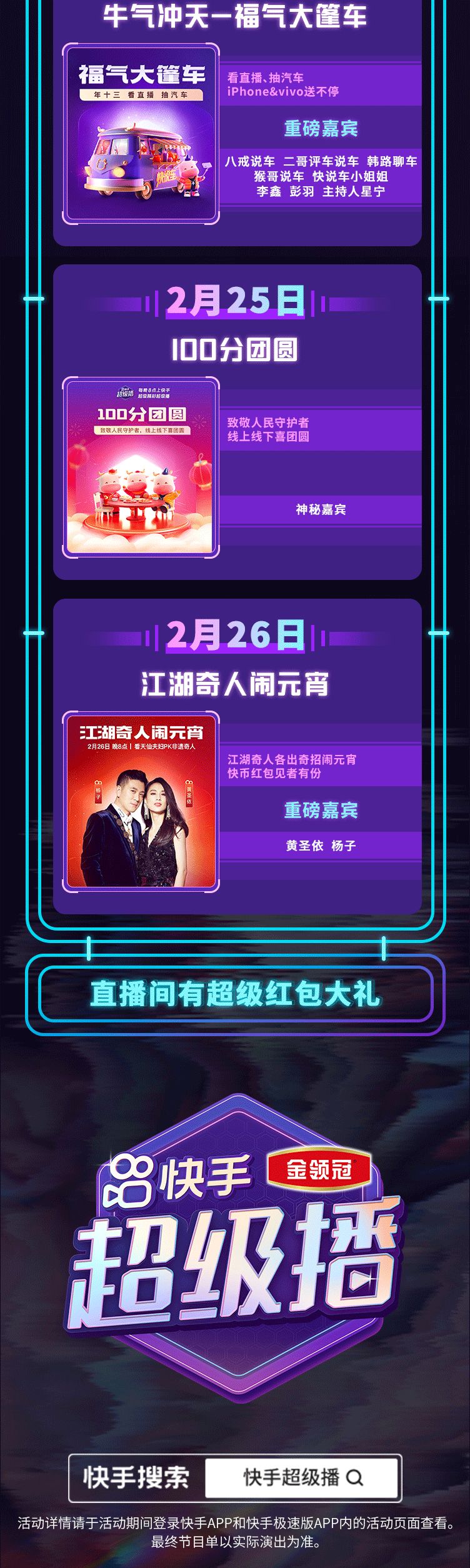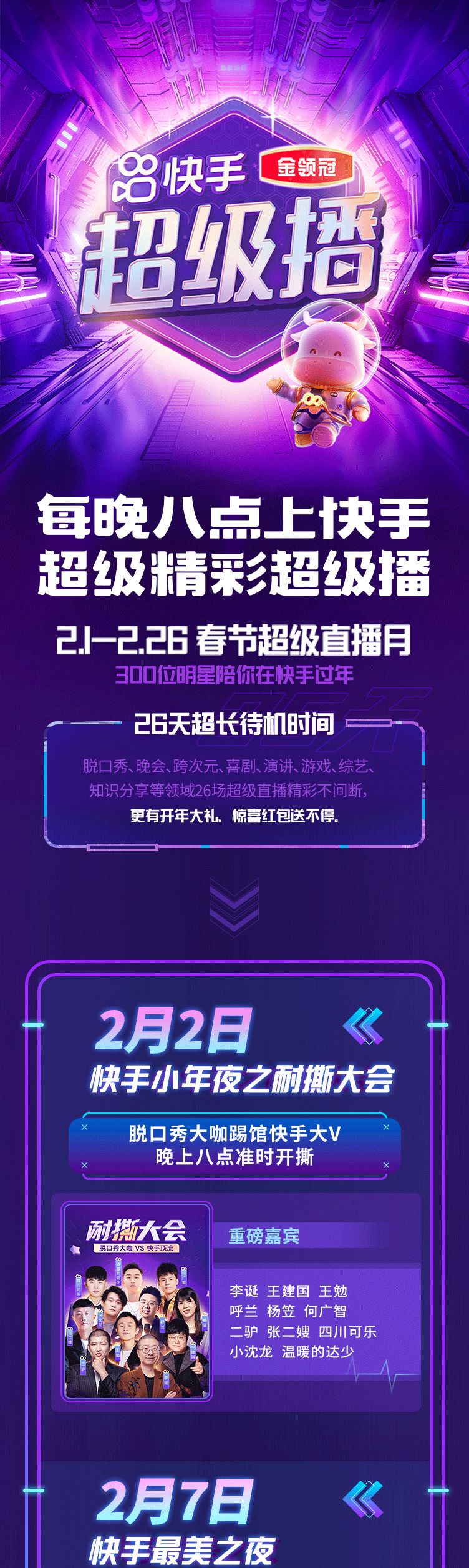 年关已到,年味渐浓。今年春节期间,快手策划了长达26天的超级播,从2月1日到26日,每晚8点,快手都为用户准备了超级精彩的直播内容,从晚会、综艺、脱口秀,到电商、旅游、美食、知识分享,品类极其丰富多元,不仅有300艺人陪你在快手过年,更有21亿红包瓜分。
