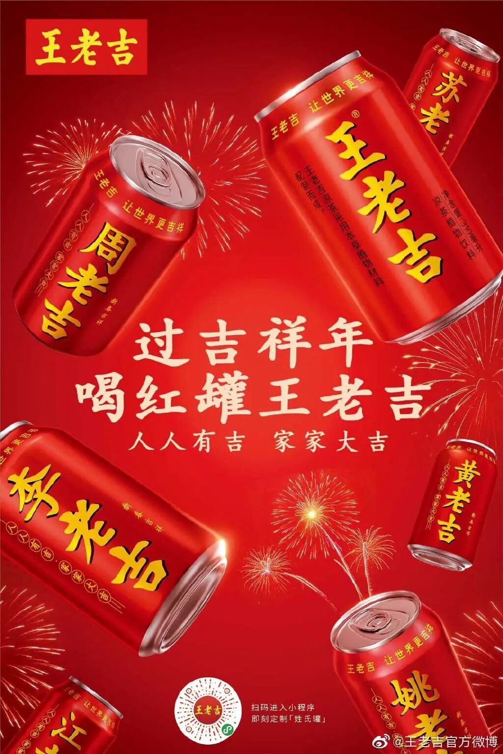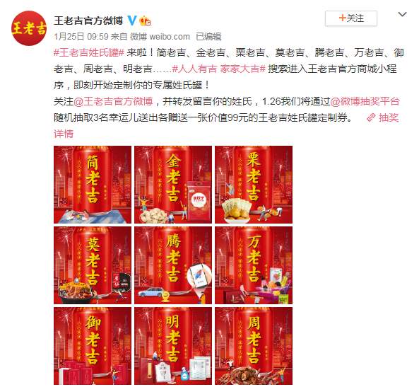 社会化营销时代,品牌营销不能再是单向的“自嗨”传播,能和消费者互动起来、玩在一起,品牌才能赢得消费者的喜爱和依赖。而就像两个人要认识,必须先交换名片知道对方叫什么一样,品牌想要和消费者social互动,也可以从名字入手。推出春节“姓氏罐”的同时,王老吉还有互动玩法,即消费者可以到微信小程序“王老吉官方商城”定制自己的专属姓氏罐。王老吉之所以叫“王老吉”,是因为其创始人姓王,是清朝道光年间的王泽邦。而借着春节营销的契机,王老吉给自己“改姓氏”的互动玩法,可以说有效地刺激了消费者的参与欲望,也让消费者感受到了一种被尊重、被重视的感觉。每一瓶姓氏罐,也提升了王老吉在消费者中的品牌影响力,增强了消费者对王老吉的情感认知。