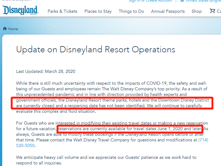 3月28日,迪士尼宣布迪士尼旗下的乐园、酒店运营时间待定。但顾客目前可以预定6月1日及之后的行程。