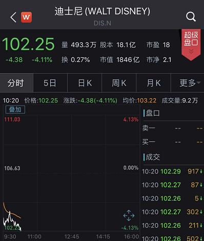 今晚美股开盘,截至记者发稿,迪士尼股价继续下挫超4%,迪士尼的最新股价为102.25美元每股,市值为1846亿美元,蒸发77亿美元(约合人民币544亿元)。