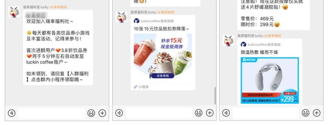 当用户选定加入的门店社群后,就会收到群管理员的一条群内互动消息,以及之后『福利官』都会在群内推送当天的限时产品、优惠券等等消息。