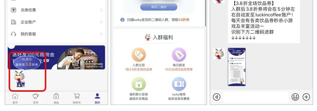 我们先来看瑞幸的私域流量闭环是如何做的,首先在小程序商店、APP页面中都有引导添加『福利官』微信,扫码之后会发现『福利官』是一个企业微信号,然后会接收到2条自动消息推送,包括入群福利以及加群的入口链接,其主要目的就是邀请加入瑞幸的线上社群。