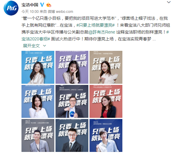 此外,宝洁还将员工化身“代言人”,“管一个亿只是小目标,要把我的项目写进大学范本”,“绿茵场上帽子戏法,在我手上就有网红爆款”...在宝洁,#只要上场就要漂亮# !诠释宝洁职场的别样漂亮!