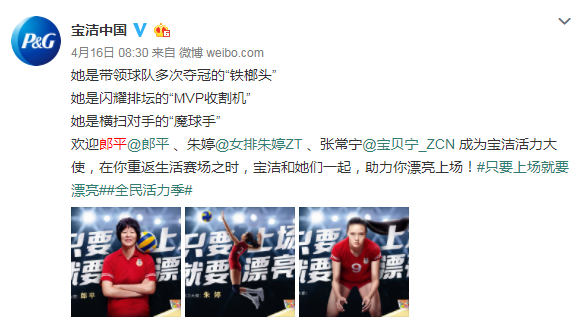从郎平和两位女排姑娘的头衔——活力大使的身份可以看出,这是宝洁活力季双方的一个短期合作。