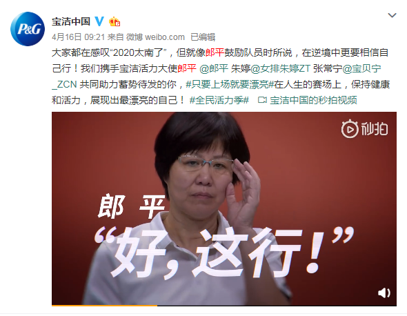 正如宝洁中国这样写道:大家都在感叹“2020太南了”,但就像郎平鼓励队员时所说,在逆境中更要相信自己行!我们携手宝洁活力大使郎平、朱婷、张常宁共同助力蓄势待发的你,在人生的赛场上,保持健康和活力,展现出最漂亮的自己!