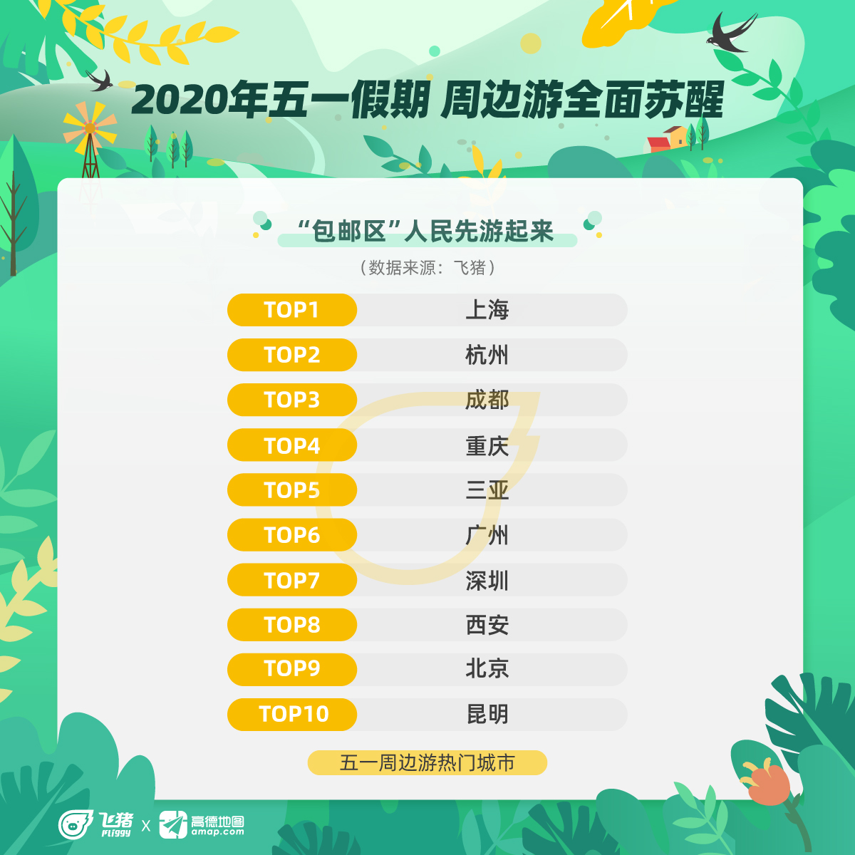 五一加快了国内旅行市场复苏的脚步,城市周边游全面苏醒。飞猪数据显示,包邮区人民首先玩了起来,上海与杭州排在五一周边游热门城市前列,爱吃爱玩的成都和重庆人也是五一出游主力。
