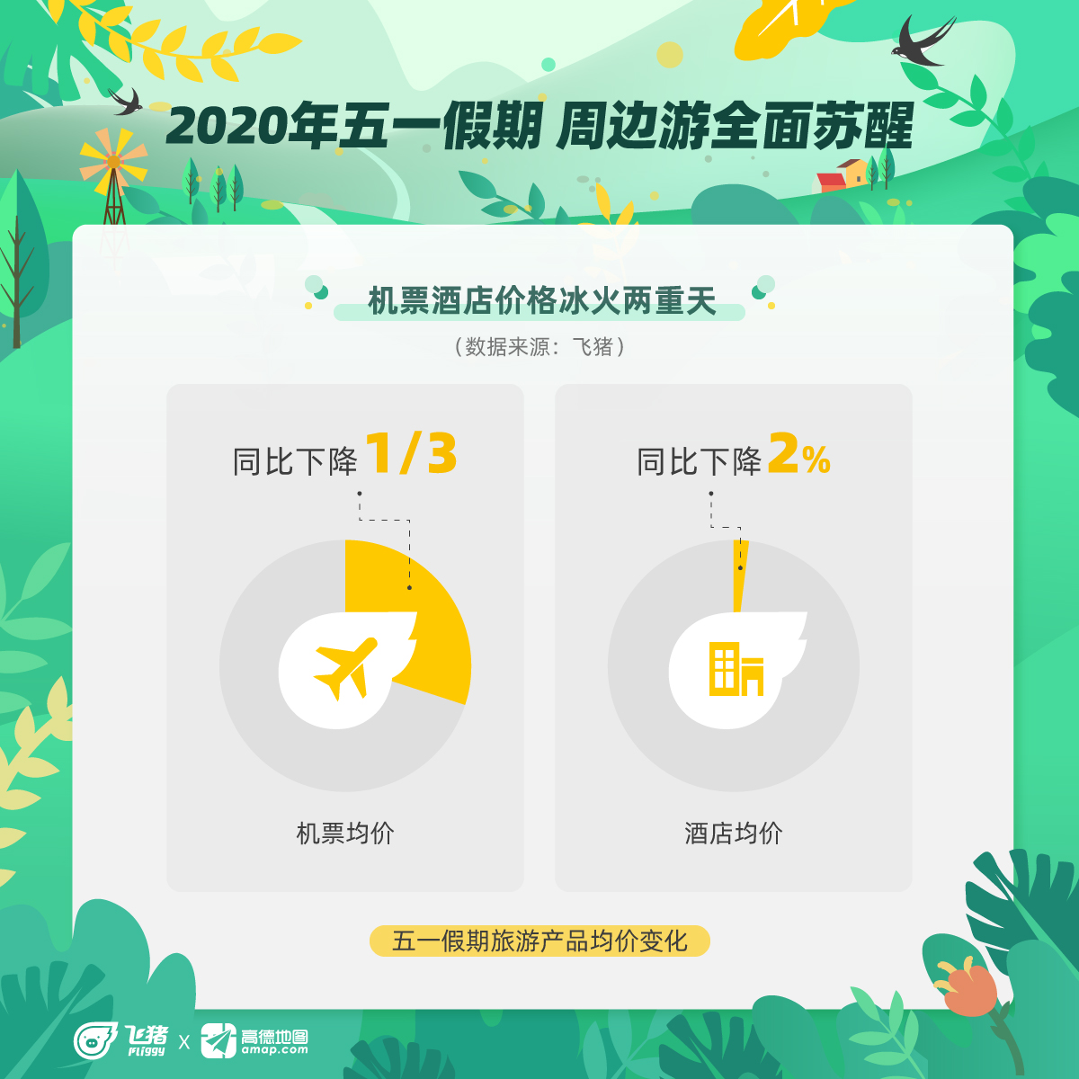 国内疫情得到有效控制后的首个5天小长假,全国人民出游热情高昂,行动谨慎。4月22日,飞猪联合高德地图发布五一出行预测数据,近三周以来,五一旅游搜索持续以超90%的周增长率攀升。周边游将在五一全面苏醒,带动城市周边度假酒店价格恢复至旺季正常水平。因不鼓励跨省旅游,五一机票均价比去年跌了近三成,往年的热门旅游航线甚至低至1折。