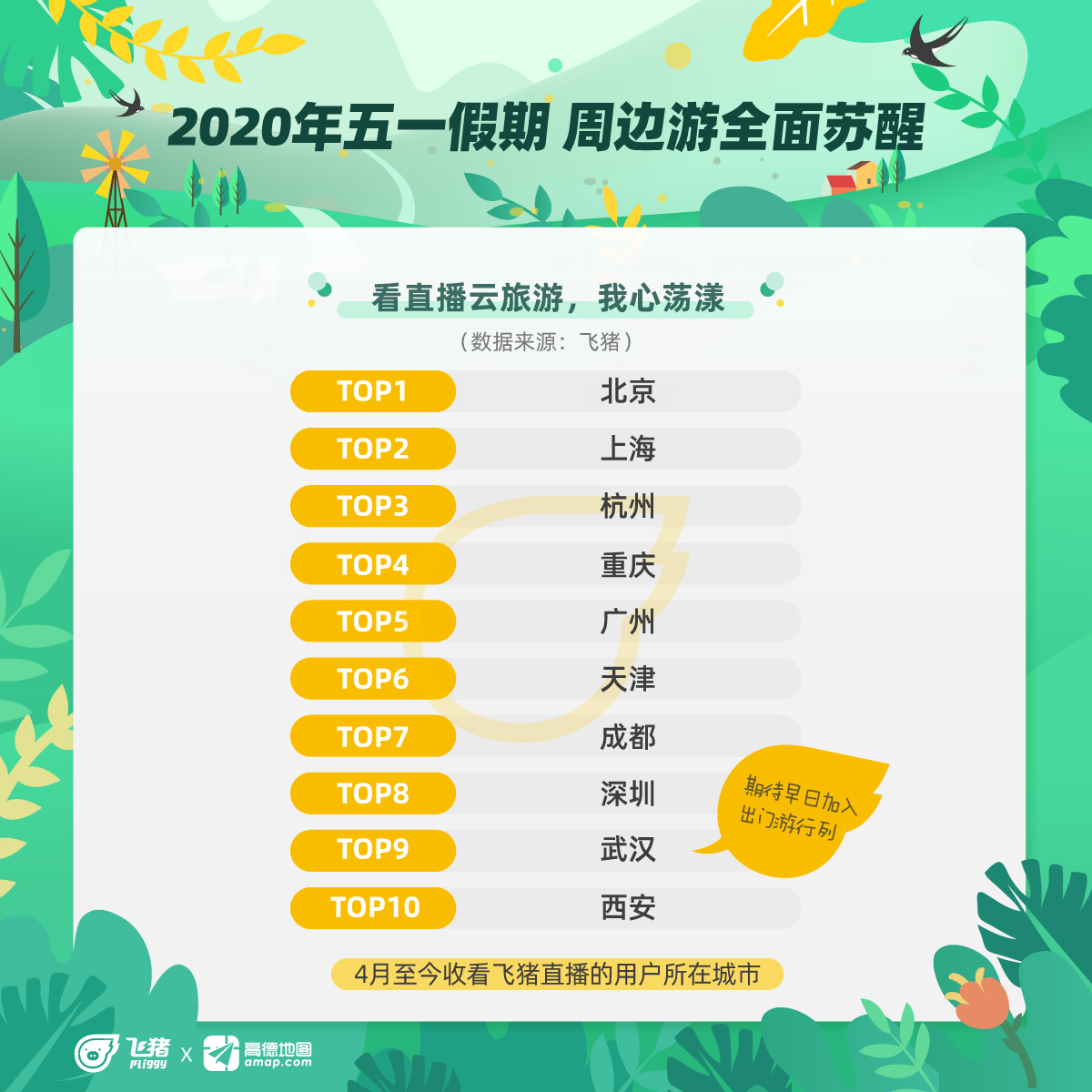 疫情以来,直播成了人们宅家云游世界的一种方式。从飞猪4月收看直播的用户统计看,北京人十分热爱看直播云旅游。4月8日迎来解封的武汉,也跻身最爱看飞猪直播的城市前十,网友纷纷温暖表示:期待早日从云游加入出门游的行列。