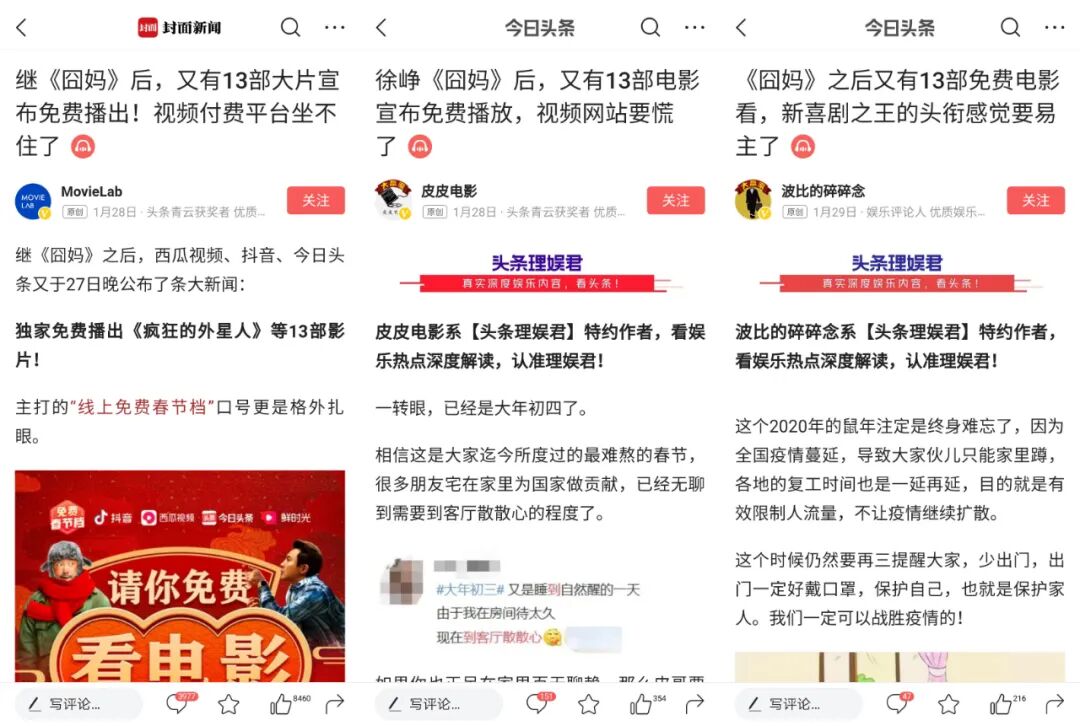 随着《囧妈》在春节免费上映,「头条理娱君」的营销价值得以淋漓尽致地发挥。达人团一方面结合《囧妈》喜剧内容,助力电影口碑的扩散传播。另一方面,@Movielab、@皮皮电影等47位「理娱君」达人为头条“免费春节档”代言,从内容付费、春节娱乐、贺岁片模式等多个角度进行解读,引发了行业思考。