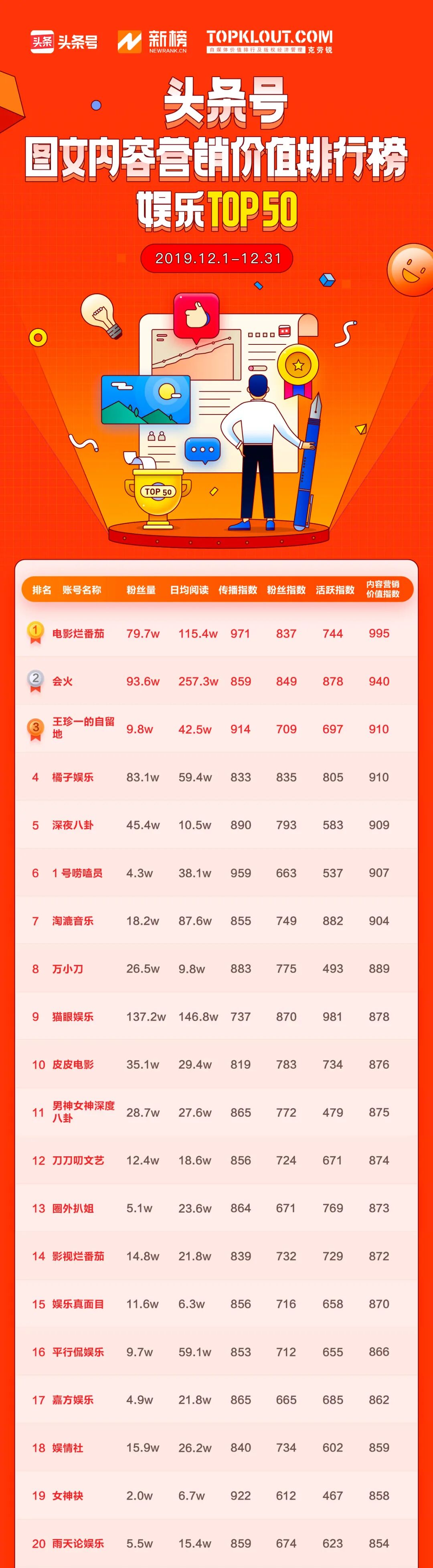 值得一提的是,这些作者均在“头条号图文内容营销价值排行榜娱乐TOP50”榜上有名。他们是今日头条从传播指数、粉丝指数和活跃指数3个数据维度经过综合运算评定出来的,在娱乐领域具有专业的见解。他们的垂直影响力,能够为广告主带去极大的营销价值。