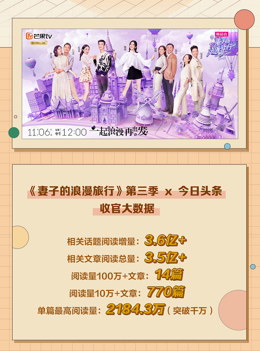 比如湖南卫视就为综艺节目《妻子的浪漫旅行3》在今日头条征文,产生了770篇10w+、14篇百万+爆文,单篇最高阅读量更是突破千万,这些文章都通过挖掘综艺亮点,推动了节目口碑的攀升。