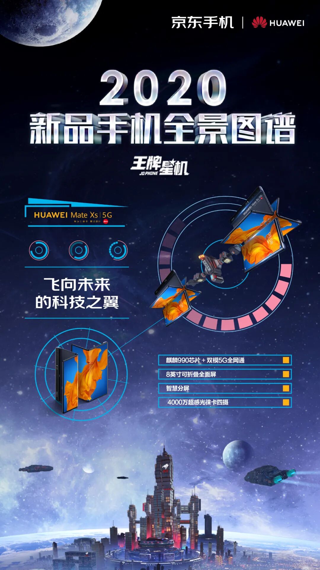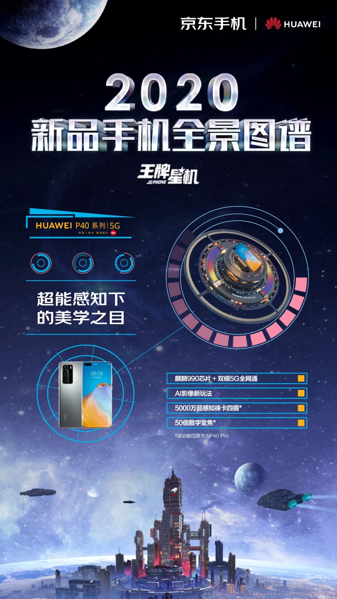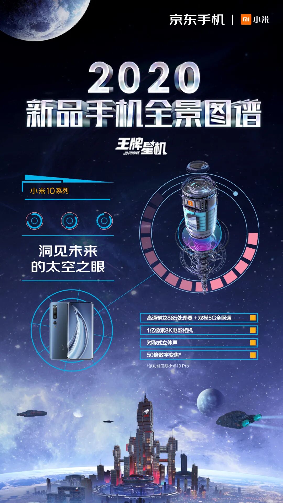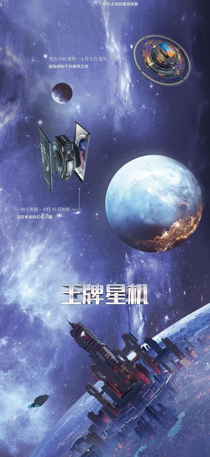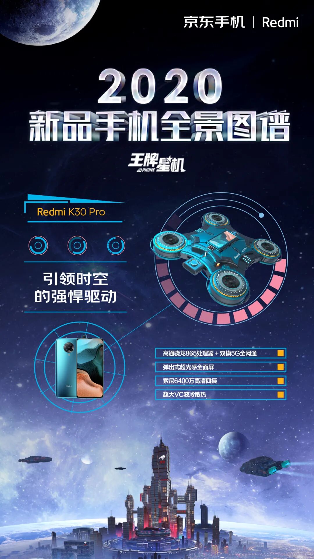 这一次,京东手机打破固守一隅地的卖货逻辑,刷新了一般手机营销模式的刻板印象,从卖点式的强销广告向消费者体验转移,摒弃一本正经的手机卖点堆砌。浩瀚的宇宙总是神秘和深邃的,而科技感、未来感一直也是手机的标签。基于这样的契合度洞察,京东手机以2020年发布的新款手机的外观和功能为设计灵感,以星系太空为灵感元素,为每款新机设计独一无二的造型。正如我们所看见的,结合华为 P40 系列「影像」卖点,为其打造的“美学之目”,以天文望远镜造型呈现小米10系列一亿像素的特点,以星际战舰造型凸显腾讯黑鲨3的强大游戏体验……同时在这个神秘的星机宇宙中,基于京东强大的物流属性,为其绘制富有未来感的“无人机”造型......整个长图看下来,可谓爽点与卖点齐飞,处处高能。「王牌星图」玩了一波心机,以不务正业的方式呈现手机卖点,融入各种酷炫的梗,真正营造了用户爽点上的体验。