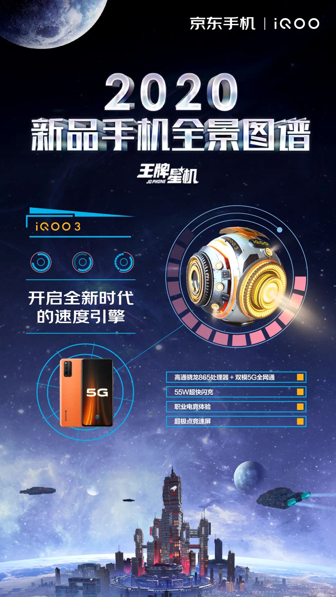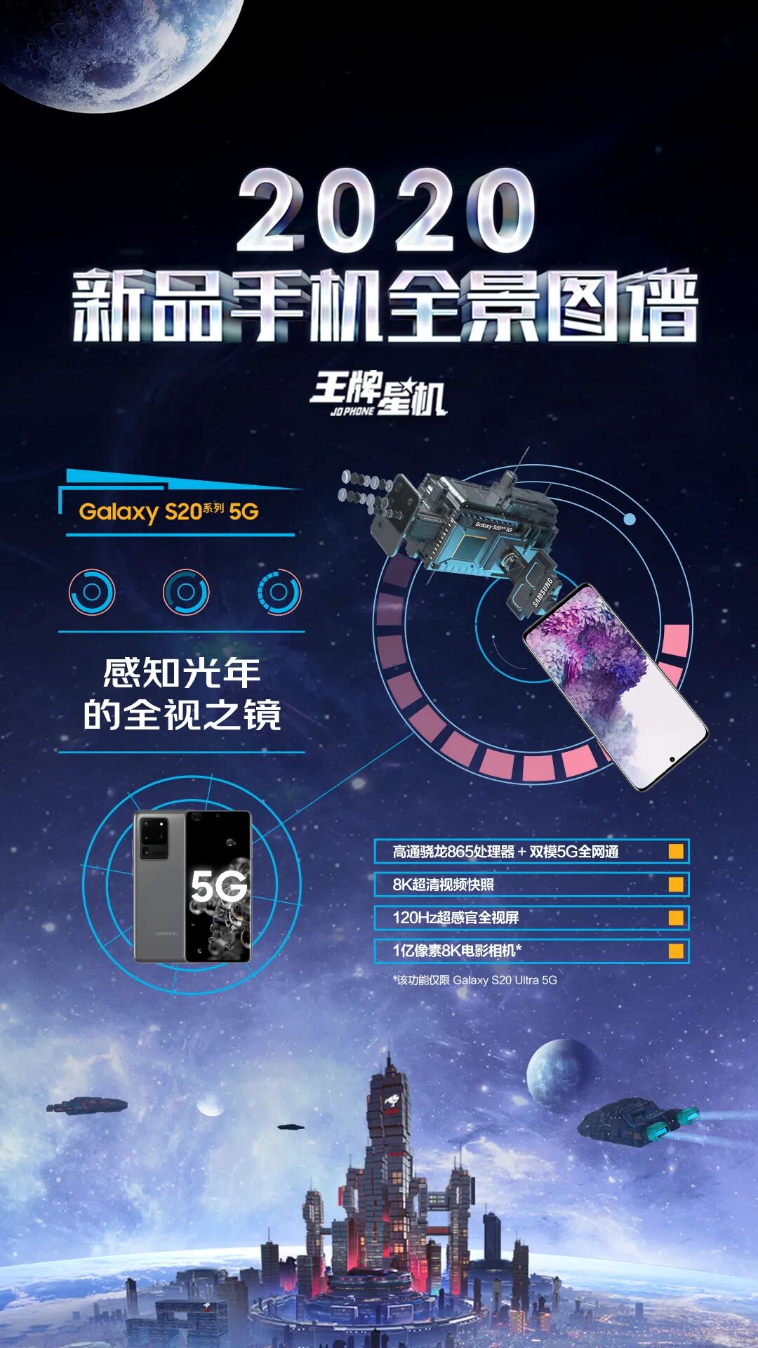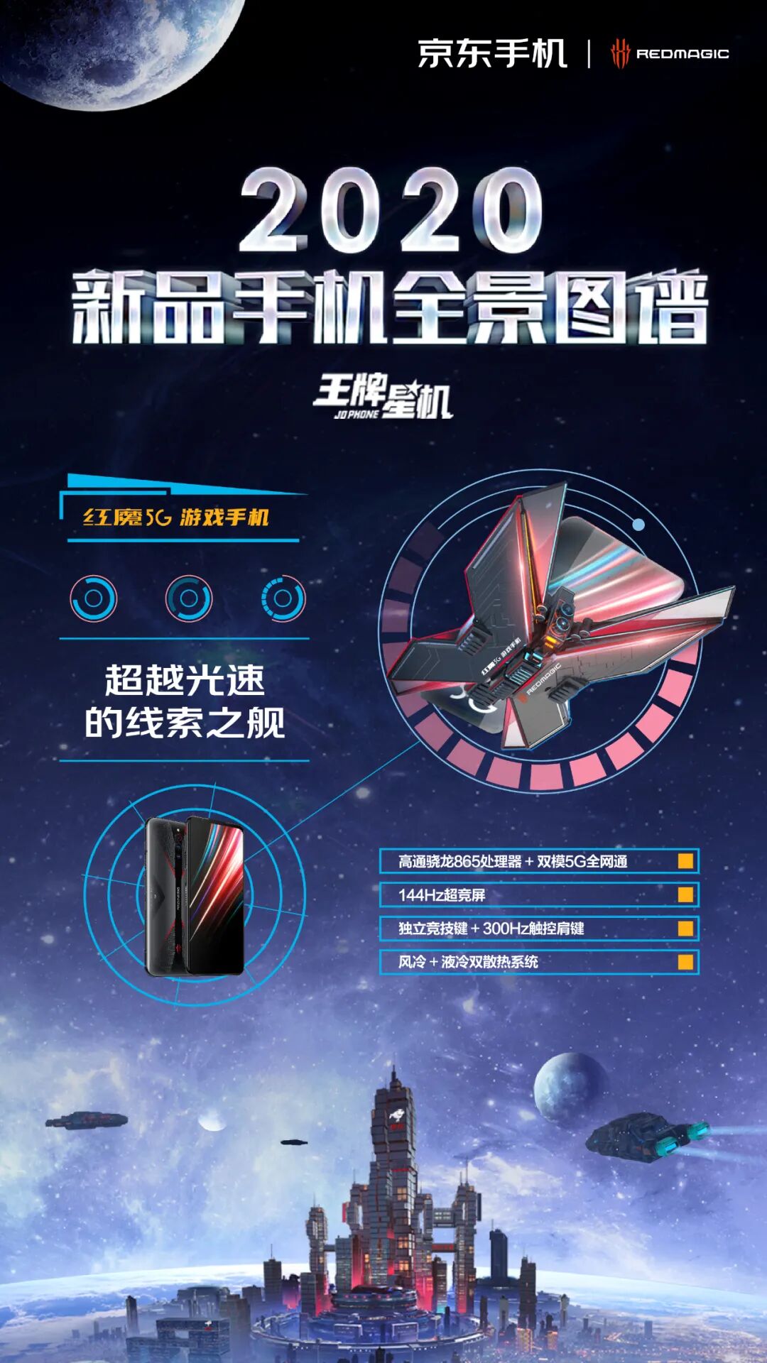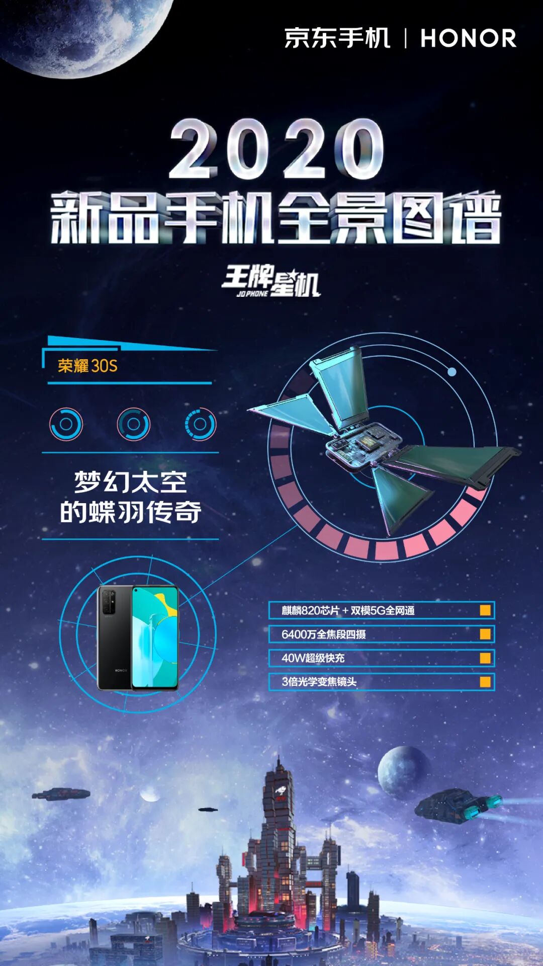 这一次,京东手机打破固守一隅地的卖货逻辑,刷新了一般手机营销模式的刻板印象,从卖点式的强销广告向消费者体验转移,摒弃一本正经的手机卖点堆砌。浩瀚的宇宙总是神秘和深邃的,而科技感、未来感一直也是手机的标签。基于这样的契合度洞察,京东手机以2020年发布的新款手机的外观和功能为设计灵感,以星系太空为灵感元素,为每款新机设计独一无二的造型。正如我们所看见的,结合华为 P40 系列「影像」卖点,为其打造的“美学之目”,以天文望远镜造型呈现小米10系列一亿像素的特点,以星际战舰造型凸显腾讯黑鲨3的强大游戏体验……同时在这个神秘的星机宇宙中,基于京东强大的物流属性,为其绘制富有未来感的“无人机”造型......整个长图看下来,可谓爽点与卖点齐飞,处处高能。「王牌星图」玩了一波心机,以不务正业的方式呈现手机卖点,融入各种酷炫的梗,真正营造了用户爽点上的体验。