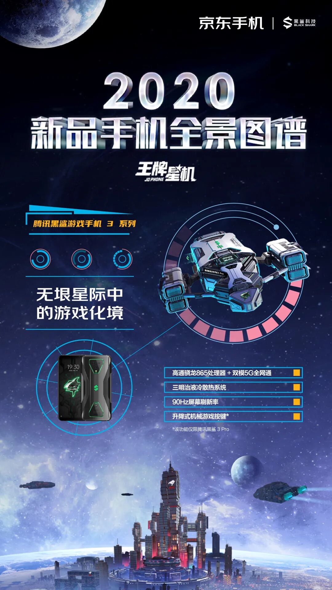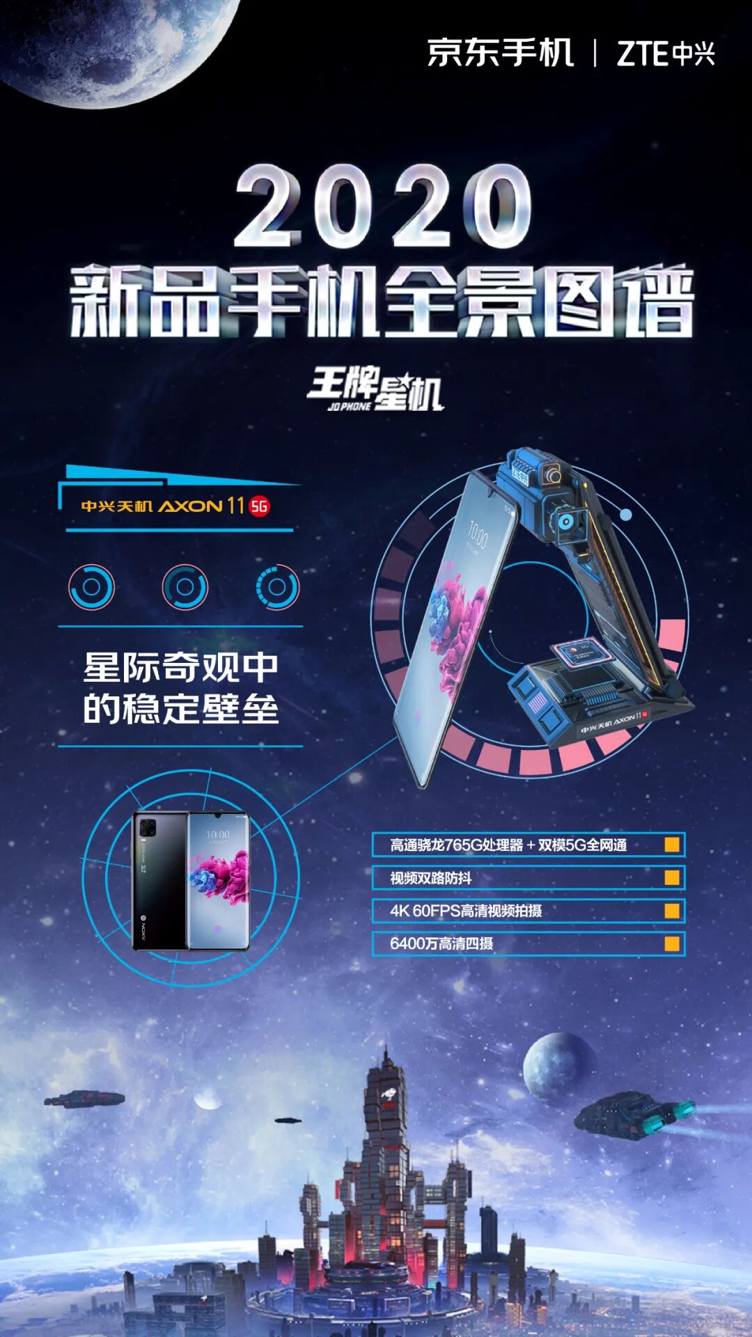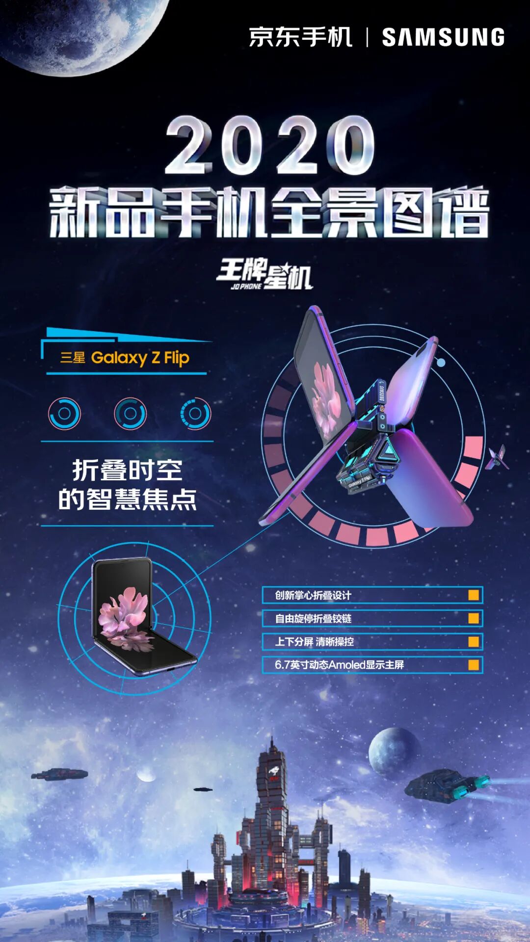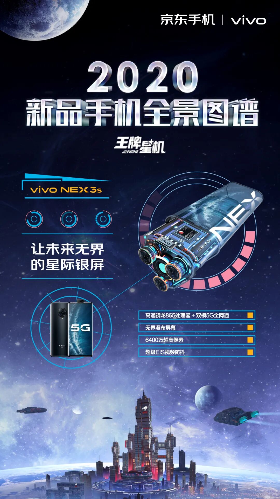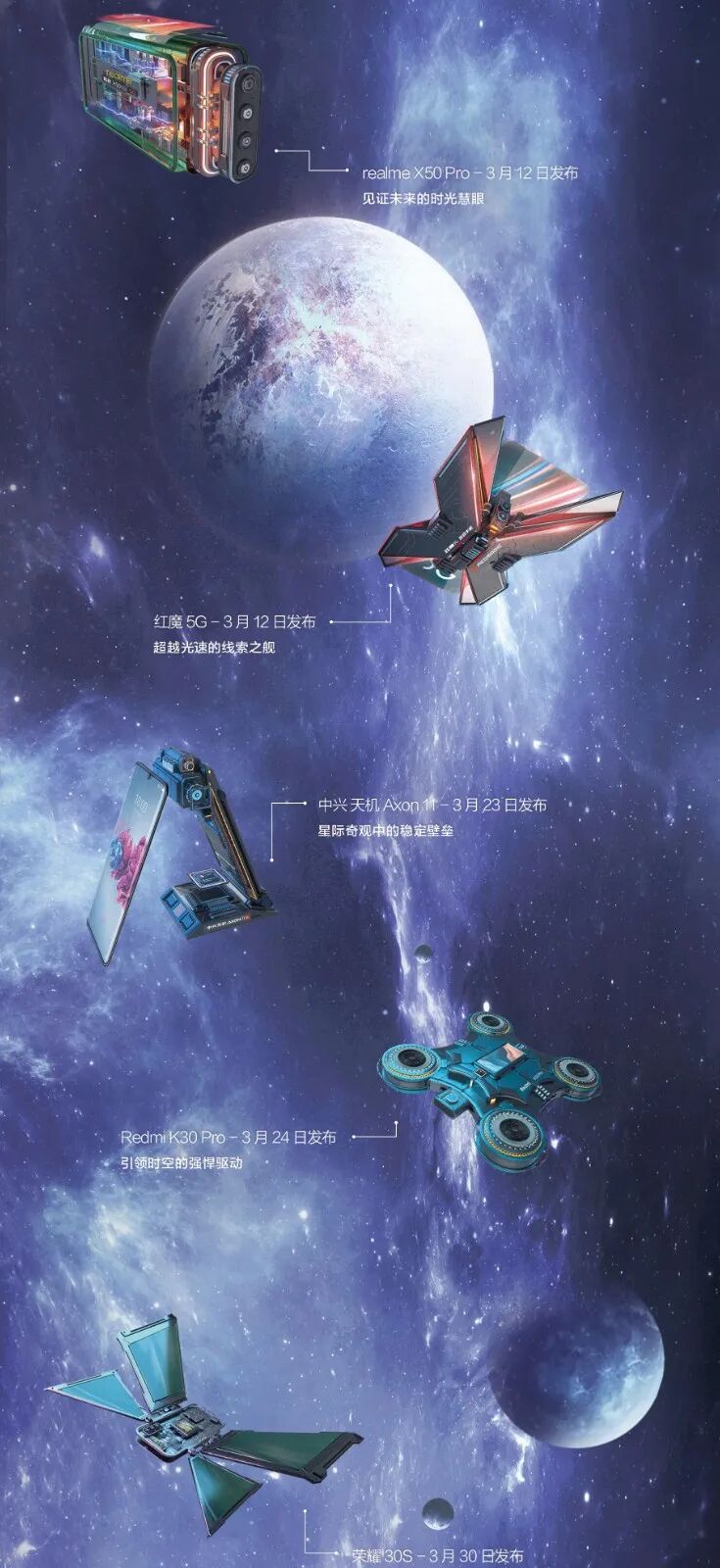 这一次,京东手机打破固守一隅地的卖货逻辑,刷新了一般手机营销模式的刻板印象,从卖点式的强销广告向消费者体验转移,摒弃一本正经的手机卖点堆砌。浩瀚的宇宙总是神秘和深邃的,而科技感、未来感一直也是手机的标签。基于这样的契合度洞察,京东手机以2020年发布的新款手机的外观和功能为设计灵感,以星系太空为灵感元素,为每款新机设计独一无二的造型。正如我们所看见的,结合华为 P40 系列「影像」卖点,为其打造的“美学之目”,以天文望远镜造型呈现小米10系列一亿像素的特点,以星际战舰造型凸显腾讯黑鲨3的强大游戏体验……同时在这个神秘的星机宇宙中,基于京东强大的物流属性,为其绘制富有未来感的“无人机”造型......整个长图看下来,可谓爽点与卖点齐飞,处处高能。「王牌星图」玩了一波心机,以不务正业的方式呈现手机卖点,融入各种酷炫的梗,真正营造了用户爽点上的体验。