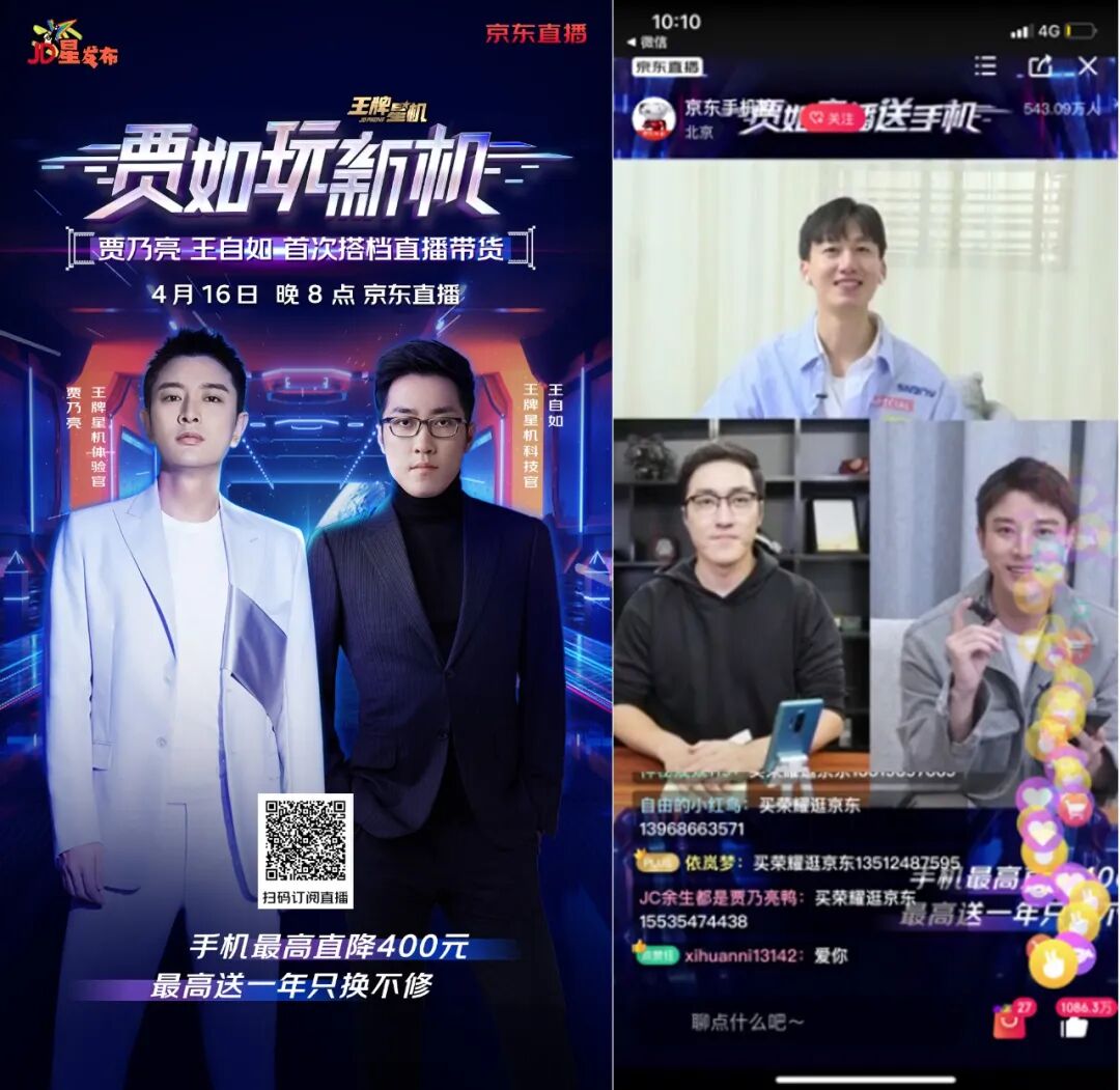 另一方面,京东手机以「贾乃亮 王自如 首次搭档直播带货」为噱头,发起「贾如玩新机」话题,提升直播的关注度,最大程度为新品季活动引流,成功引爆bigday首日销量。最后的传播数据也印证了直播的成效,#贾如玩新机#微博话题量突破3501万,直播观看量突破543万。